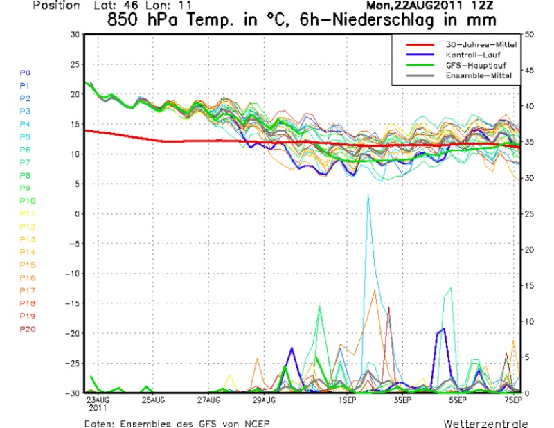 Nel grafico allegato le linee in alto individuano la temperatura ad 850 hpa (circa 1500 metri di altezza) quella inferiore le precipitazioni in mm. Sembrano abbondanti (ma è presto per dirlo) le precipitazioni nella prima settimana di settembre.