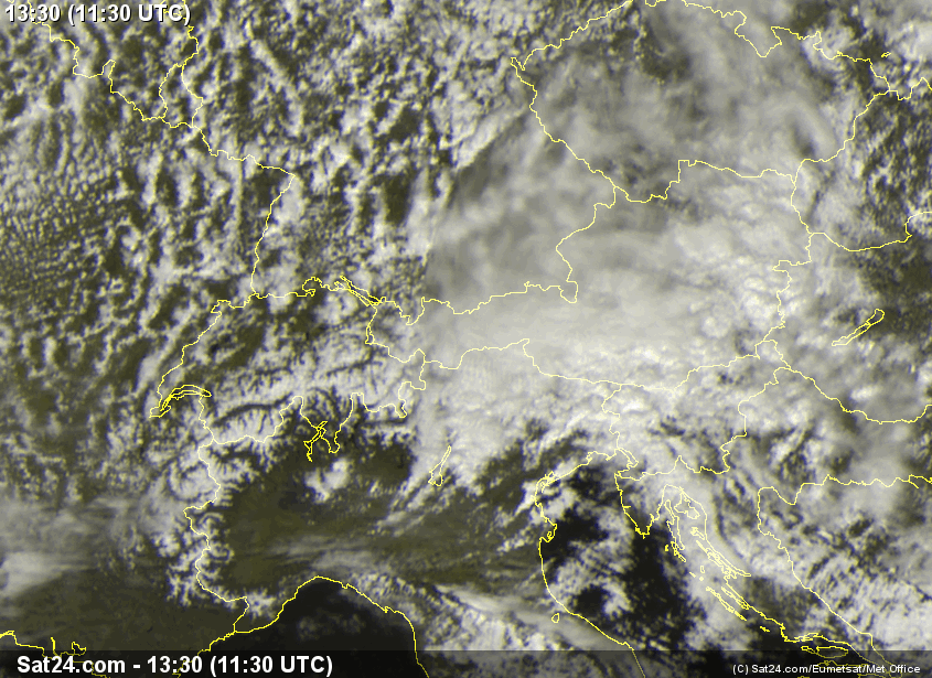 Migliorerà in serata, la foto del satellite delle ore 13.30 è piuttosto eloquente (nuvole che praticamente ricoprono il Trentino Alto Adige formandone addirittura i confini), poi pioverà abbondantemente nella giornata del 24 aprile, in seguito un aumento deciso delle temperature in attesa di un nuovo peggioramento (da verificare visto che mancano ben 7 giorni) nel giorno 29.