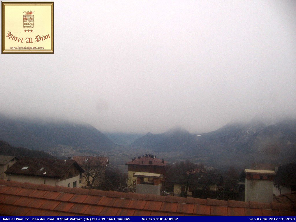 Qui sotto un'immagine catturata dall'hotel Al Pian di Pian dei Pradi che mostra la neve che sta già cadendo fino a quota 1200 metri circa alle ore 14.00, alle 14.00 tra l'altro a Levico Terme la temperatura è ancora sotto lo zero, potrebbe profilarsi il primo giorno di ghiaccio dell'inverno (giorno con temperatura inferiore allo zero tutto il giorno).