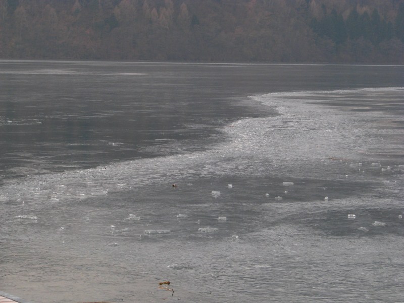 Un paio di foto del lago di Levico ghiacciato, del Rio e del nevischio a Levico Terme.