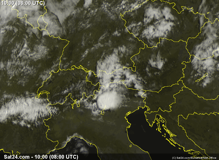 Piuttosto singolare l'evoluzione del tempo durante questa giornata, la mattina si annuvola piuttosto rapidamente dopo il sorgere del sole, la massa nuvolosa in un certo momento copre il Trentino e solo parte dell'Alto Adige, praticamente sereno su tutto il resto d'Italia (vedi foto satellitari qui sotto). Le precipitazioni a Levico Terme la mattina sono moderate con un accumulo di 3,8 mm, ed il cielo si rasserena già in tarda mattinata.