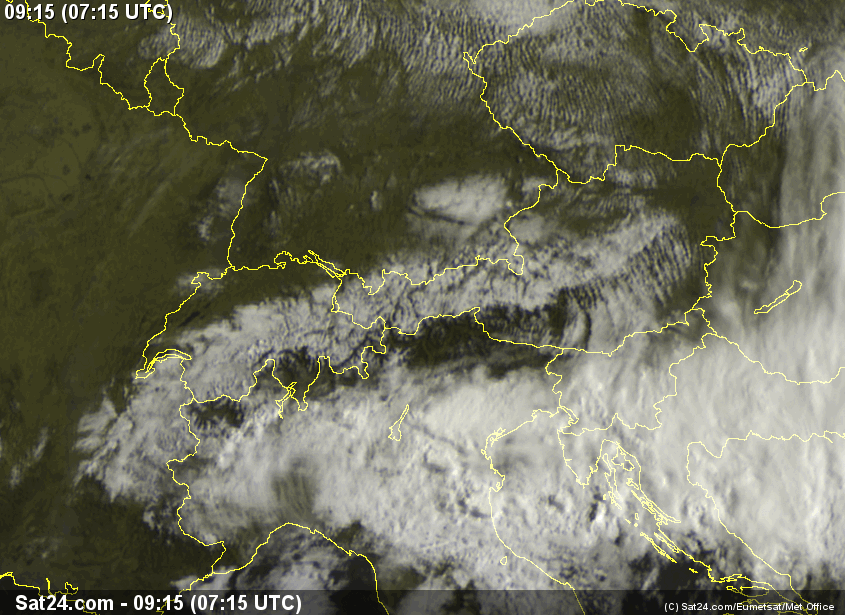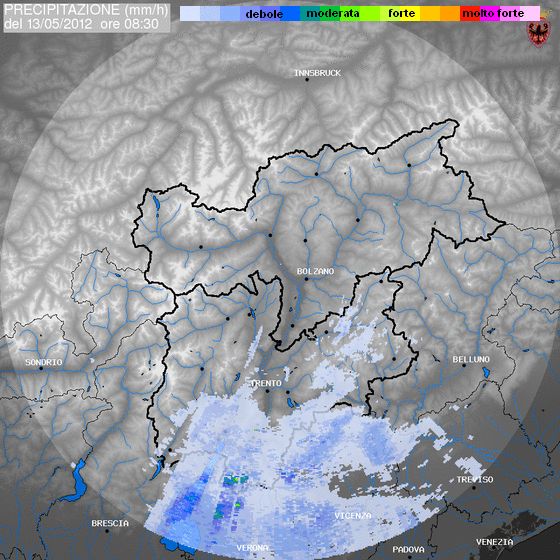 Eloquenti sono le immagini che ho inserito qui sotto, la foto satellitare di ieri mattina (si vede il fronte freddo ancora al confine con Austria e Svizzera), la foto satellitare della mattina del 13 maggio (il fronte è passato ma già ampie schiarite a nord della Regione) e soprattutto il radar che mostra le precipitazioni solo nella parte sud della regione, anzi più in Veneto. Il foehn, vento da nord di ricaduta orografica, ha spinto il fronte subito a sud delle Alpi.