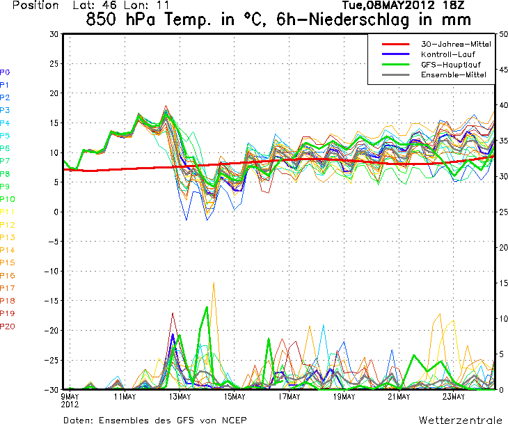 I modelli fisico matematici (vedi foto sotto) prevedono aumento delle temperature fino a venerdì, poi nel week-end, in particolare domenica, brusco calo delle temperature, che a quota 1500 metri circa (riga superiore della tabella) caleranno anche di oltre 12°C, previste precipitazioni a carattere temporalesco in particolare domenica.