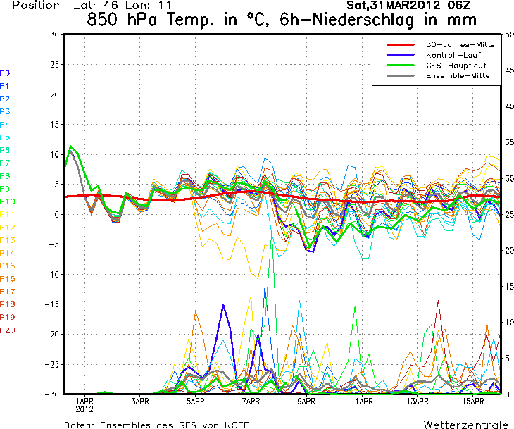 Dopo che si chiude uno dei mesi di marzo più caldi di sempre e molto secco, finalmente all'orizzonte si vedono delle precipitazioni, qui sotto il modello fisico matematico GFS che mostra come dal 4/5 aprile sono in arrivo diversi giorni piovosi e prima ancora un sensibile calo delle temperature. Nella tabella, il grafico nella parte inferiore mostra le precipitazioni previste mentre quello nella parte superiore mostra le temperature previste ad una quota di circa 1500 metri.