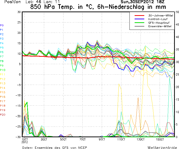 Caduti anche questa notte 9,4 mm di pioggia, che chiudono una settimana piovosa a Levico Terme, ma a partire dal 3 ottobre dovrebbe aprirsi un periodo caratterizzato da alta pressione e nessuna precipitazione. I modelli fisico matematici qui sotto evidenziano infatti (grafico inferiore) la totale assenza di precipitazioni dal 4 al 10 ottobre compresi, è un po' presto, stiamo a vedere.