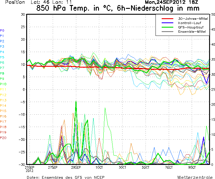 Ieri caduti 7 mm in quel di Levico Terme, molto meno che in altre zone del Trentino (a Gardolo 40 mm ad esempio), questa mattina nubi basse mentre i modelli fisico matematici mostrano una settimana all'insegna della pioggia, in particolare nei giorni 26, 29 e 30 (si tratta della linea inferiore del grafico allegato, che mostra le precipitazioni previste a Levico Terme nei prossimi 15 giorni). Dal grafico sembrerebbe profilarsi una prima settimana di ottobre "asciutta" ma è ancora presto per dirlo.