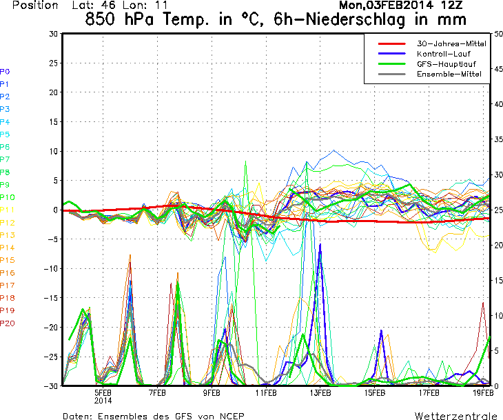 I modelli fisico matematici (vedi allegato) annunciano precipitazioni ancora fino al 13 febbraio con brevissimi intervalli, le precipitazioni sono i picchi del grafico inferiore.