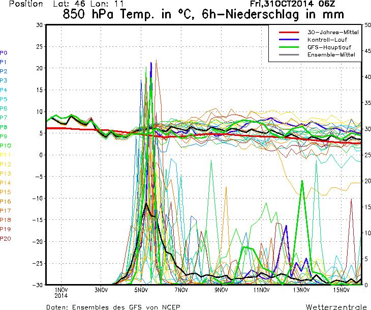 Le precipitazioni sono evidenziate dal grafico inferiore, mentre il grafico superiore mostra la temperatura prevista ad una quota di circa 1500 metri.
