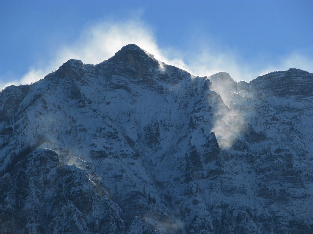 Cielo terso e neve alzata dal vento per diverse decine di metri sulle cime, vedi foto allegate.