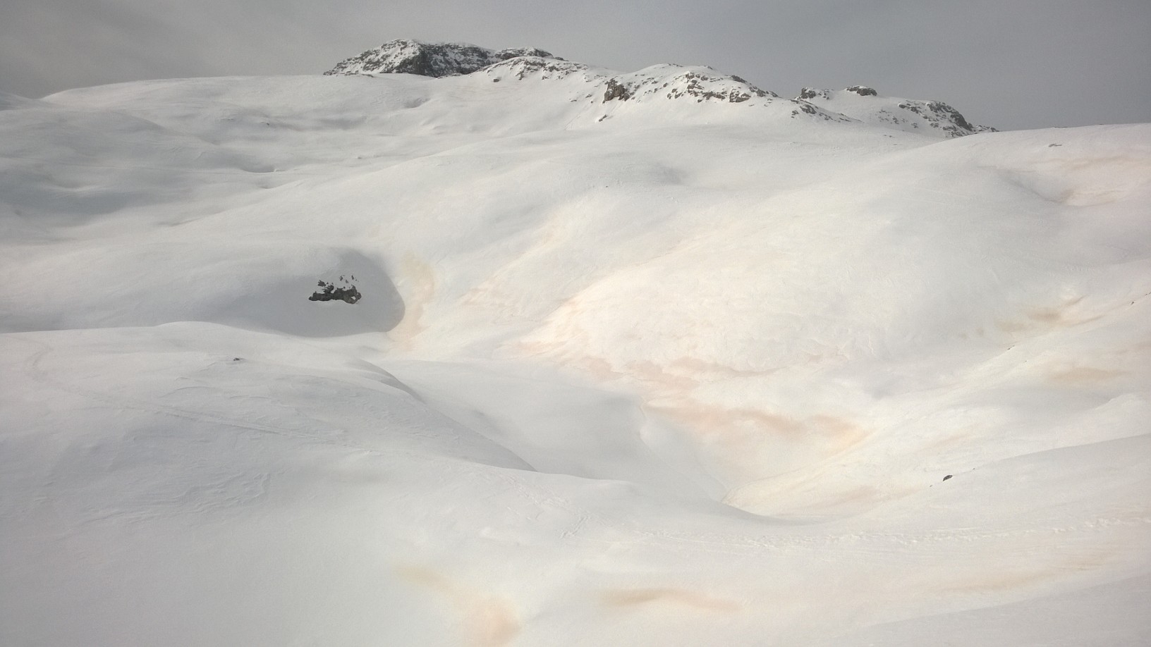 Qui allegato una foto satellitare del 22 marzo in cui si vede chiaramente la sabbia che dalla Tunisia sale verso nord, mentre le altre foto le ho scattate domenica 3 aprile sulle Pale di San Martino e si vedono chiaramente le "macchie" di sabbia sulla neve.