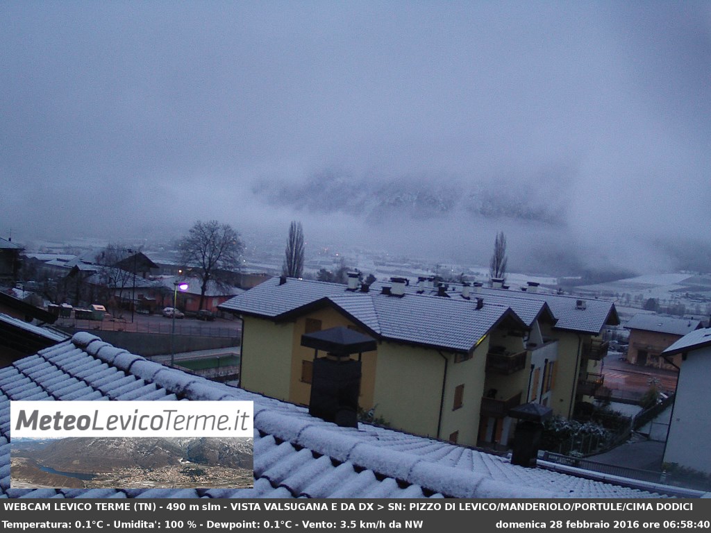 Ieri la massima a Levico Terme aveva raggiunto i 6°C, poi nella serata è iniziato a piovere con una temperatura di circa 5°C, durante la notte l'intensità delle precipitazioni ha favorito un calo termico di oltre 4°C, tant'è che la minima ha raggiunto i -0,1°C ed è nevicato intorno tra le 4 e le 6 di mattina.