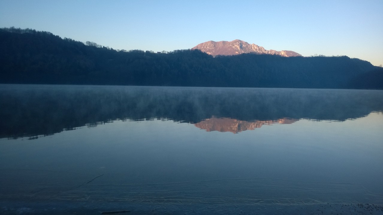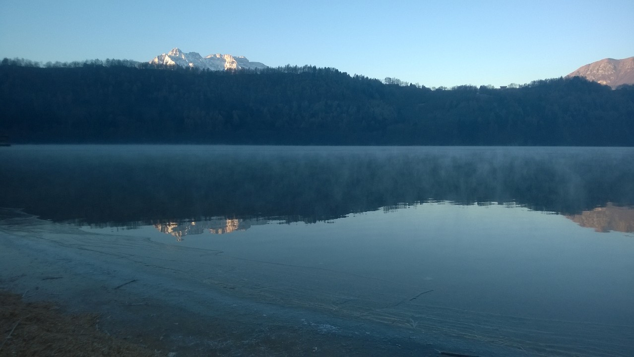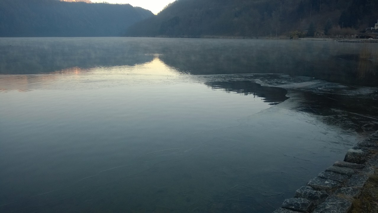 Questa mattina alle ore 08.30 la temperatura dell'aria sulla spiaggia di Levico era di -9,4°C mentre quella dell'acqua ad una profondità di circa 30 cm era di +2,7°C. Si stanno già formando i primi pezzi di ghiaccio, per esperienza, in queste situazioni nel giro di qualche giorno il lago dovrebbe essere ghiacciato.