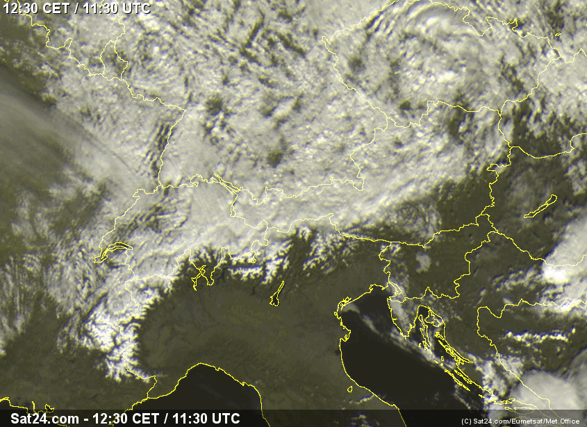 La situazione mostra come da noi le Alpi blocchino l'accesso delle perturbazioni da nord, stau e neve quindi in Austria. Ben visibile la poca neve sulle montagne trentine.