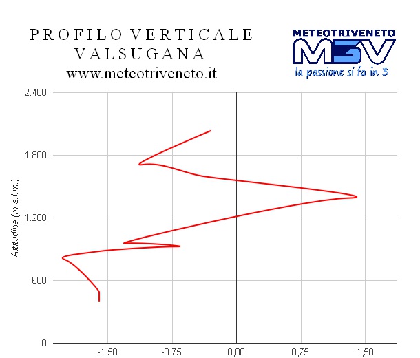 Piuttosto evidente la situazione termica della colonna d'aria sopra Levico dalle temperature rilevate alla stazione del Compet (a quota 1390 metri) +1,4°C in montagna e -1,4°C in fondovalle.