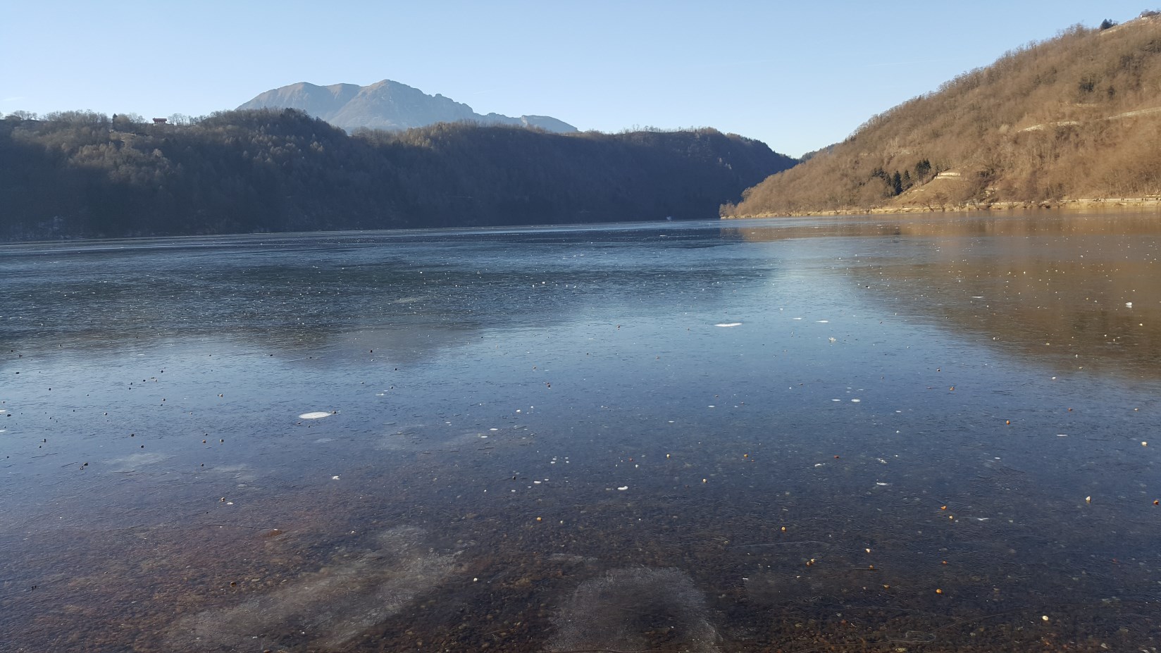In questi anni di rilevazioni ho potuto notare che non appena la temperatura dell'acqua si avvicina ai 3°C (la densità massima dell'acqua viene raggiunta a 4°C) nel giro di pochi giorni il ghiaccio inizierà a formarsi, ovviamente se permangono condizioni di cielo sereno e temperature sotto lo zero. Domenica 15 gennaio l'acqua del lago misurava ancora +3,4°C e non c'era ghiaccio, ma nel volgere di alcuni giorni si è ghiacciata interamente.