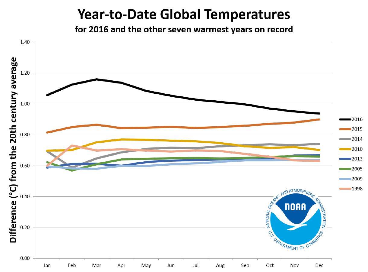 Il 2016 si era chiuso per il Pianeta (come il 2014 e il 2015 peraltro) come anno più caldo nella serie di 137 anni del NOAA (National Oceanic and Atmospheric Administration che è un’amministrazione federale degli Stati Uniti che si occupa di meteorologia e climatologia) “grazie” al contributo di otto dei dodici mesi (da gennaio a settembre con l’eccezione di giugno), che sono stati i più caldi di sempre e gli altri mesi si sono collocati tra i cinque più caldi di sempre. Ottobre, novembre e dicembre 2016 sono stati i secondi più alti della loro categoria, "e in ognuno dei tre casi hanno superato i record del 2015". (vedi fig. 1 e 2)