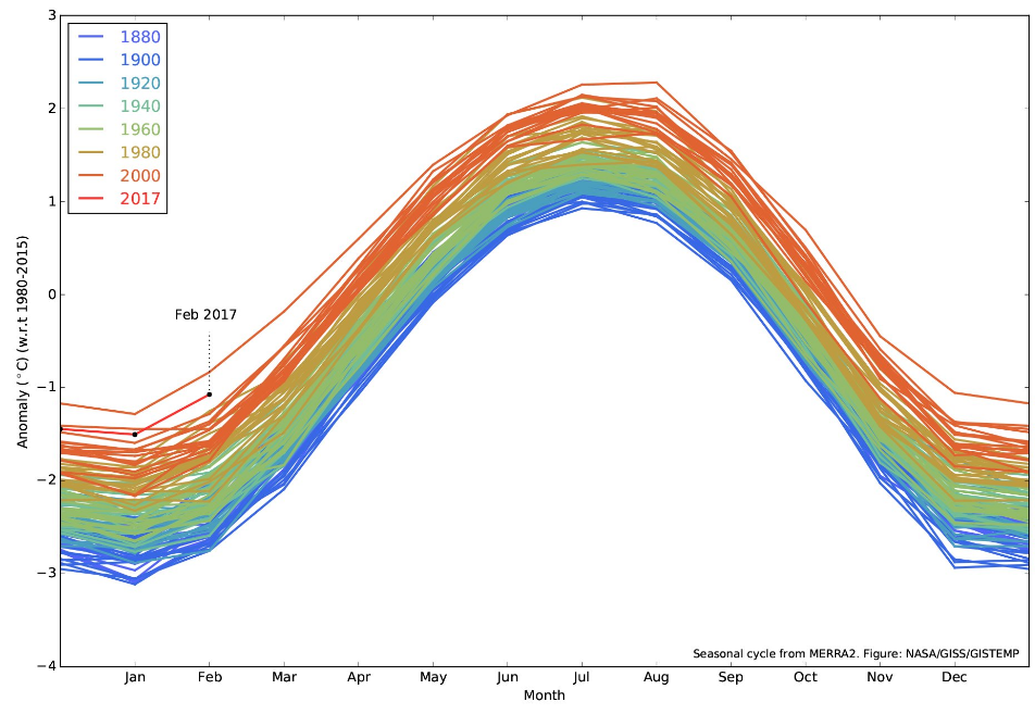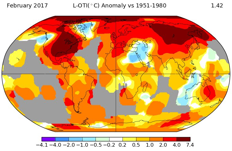 E il trend del 2016 ha purtroppo avuto una conferma nel mese di febbraio 2017 (attendendo i dati di marzo…) che è stato il secondo più caldo degli ultimi 138 anni (vedi fig. 3 e 4).
