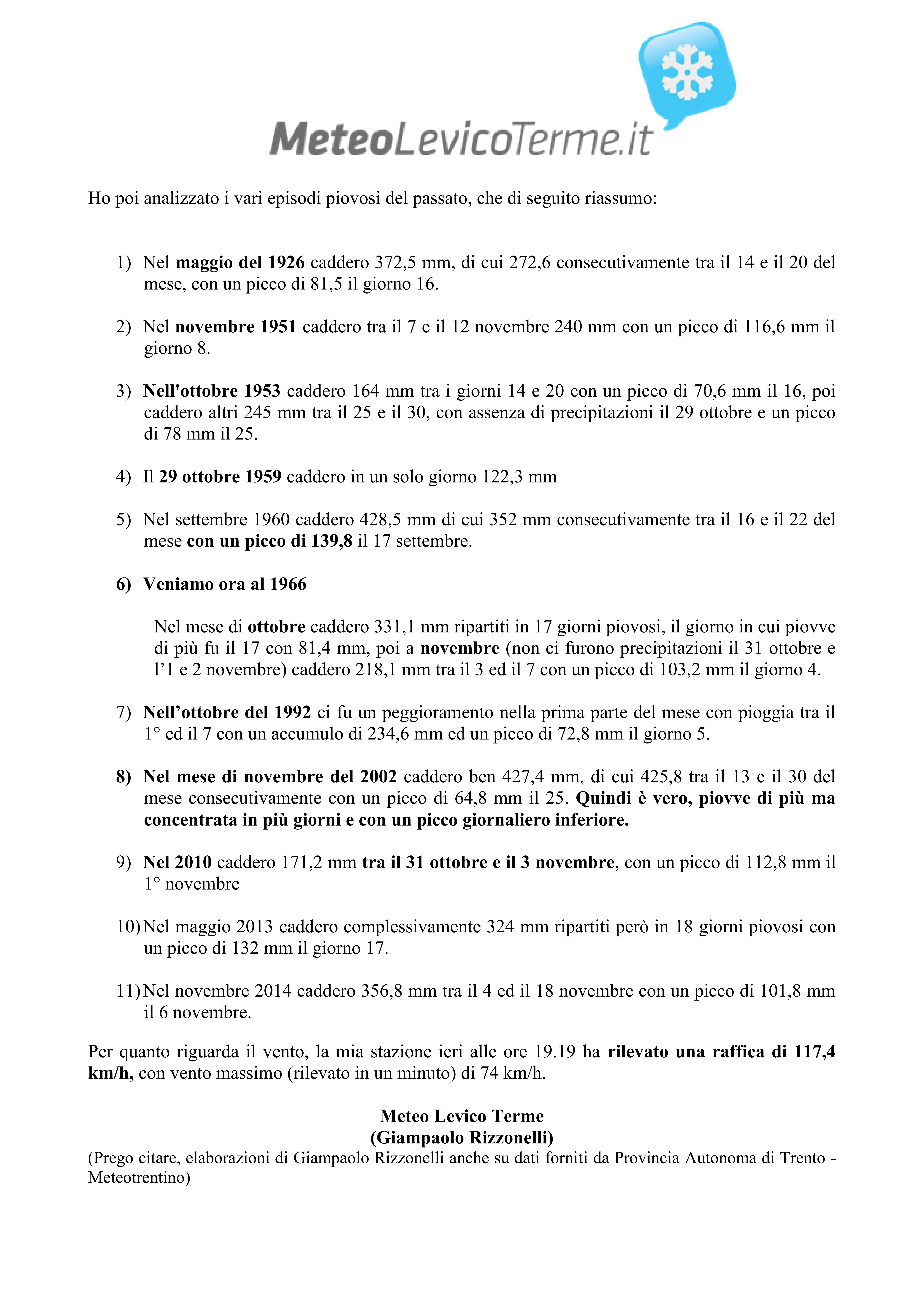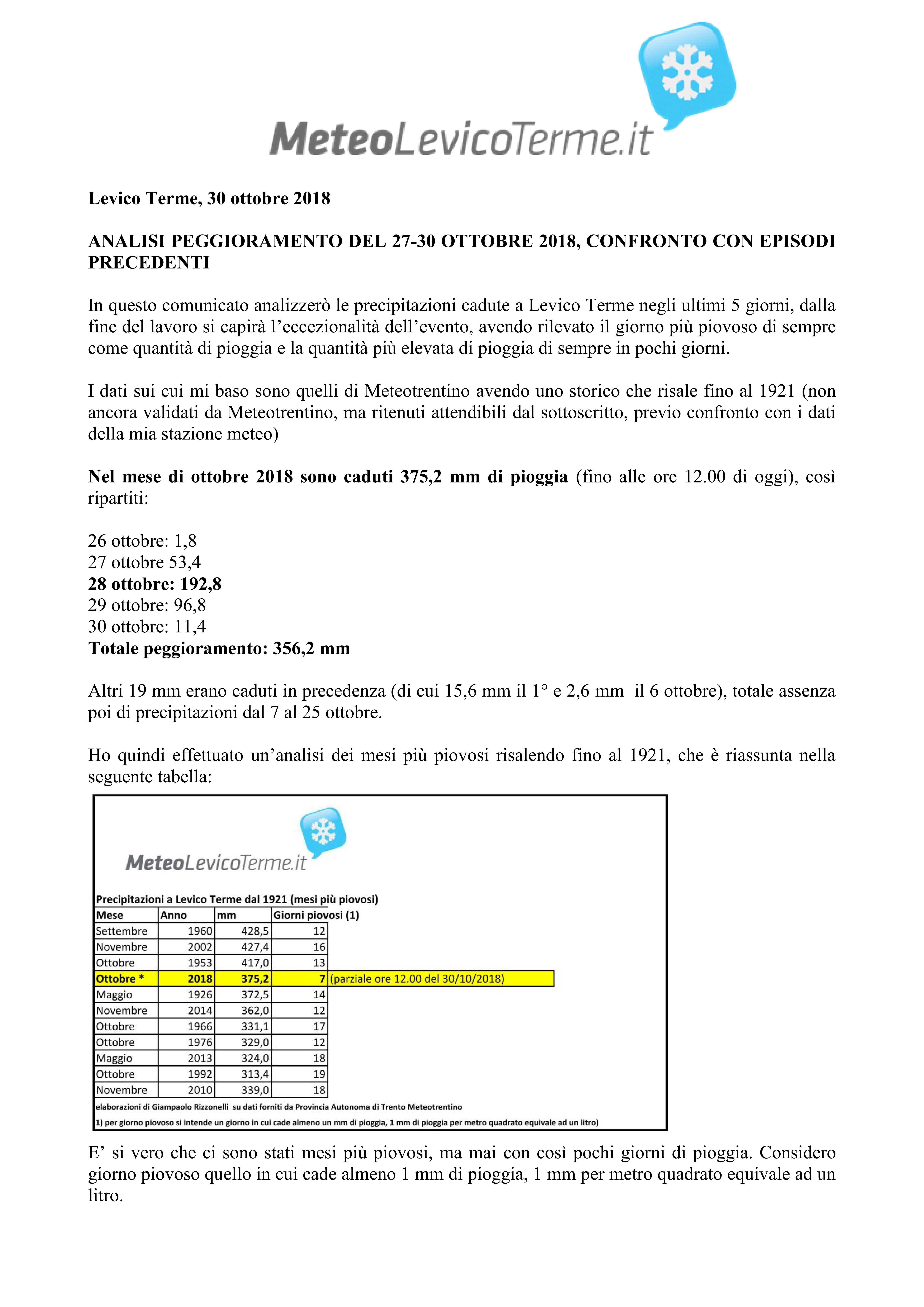 Dall'analisi emerge l'eccezionalità dell'evento quanto a picco di precipitazione giornaliero e pioggia cumulata nei 5 giorni.