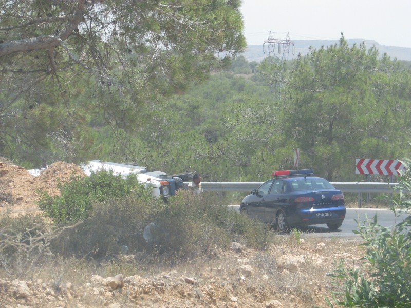 durante il tragitto incontriamo anche un camion ribaltato che tentano di rialzare trainandolo (dubito che ci saranno riusciti). Incontriamo molte caserme e presso il confine ci colpisce come siano state costruite in mezzo alla macchia mediterranea delle piste per i carri armati, per permettere di raggiungere le colline più alte. Al confine con la Cipro "riconosciuta"  ci colpisce vedere dei villaggi completamente distrutti dai bombardamenti, inaccessibili, probabilmente come abbiamo sentito dire ci sono dei campi minati.