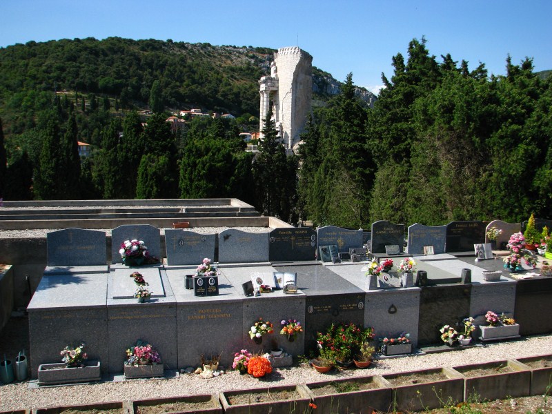 Entriamo anche nel cimitero di La Turbie posto su un’amena collina, ci colpiscono due cose, il tipo di tombe, sembra che le bare non vengano sepolte ma inserite in una specie di sarcofago di cemento rivestito di marmo, la seconda cosa sono i cognomi, perlopiù italiani.