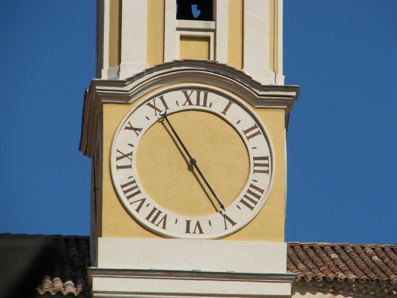 Nella piazza fotografo il campanile del paese che è caratteristico in quanto ha un'unica lancetta.