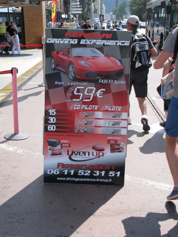 Sulla Promenade affittano anche una Ferrari, costa 59 Euro un giro come co-pilota e 115 Euro come pilota, il tutto per soli 15 minuti, in sostanza il tempo di accenderla e fare tre semafori che qui non mancano, in realtà con 390 Euro si possono fare 60 minuti come pilota (vedi foto), mah...