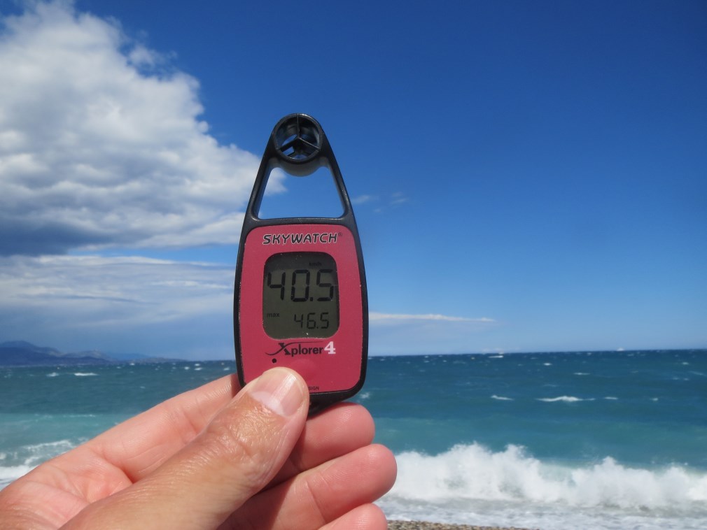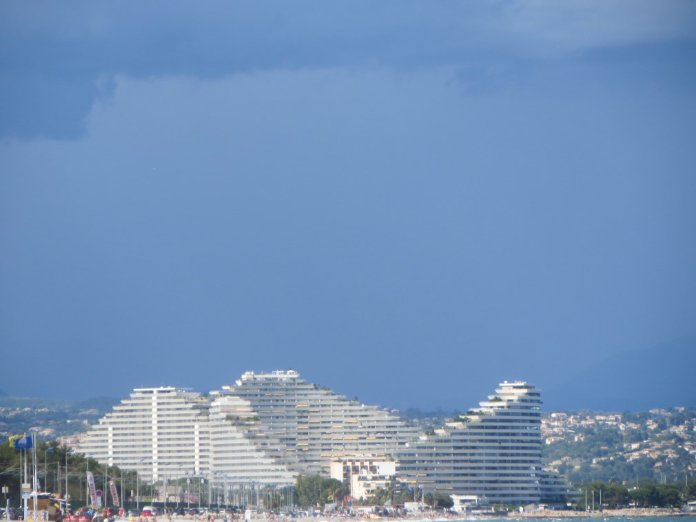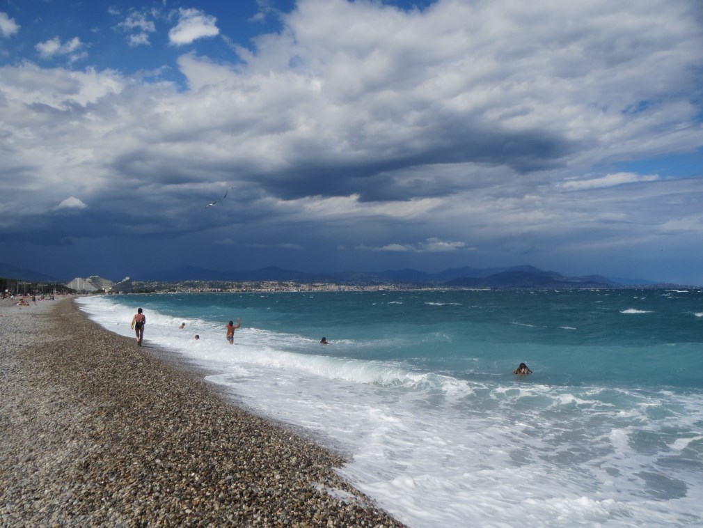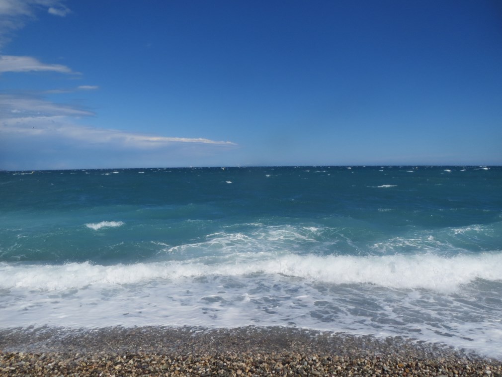 Rientriamo alla Baia degli Angeli a Biot dove tira un vento forte (50 km orari le raffiche ma vento sui 40 km/h), faccio il bagno in mezzo ai cavalloni, fantastico.