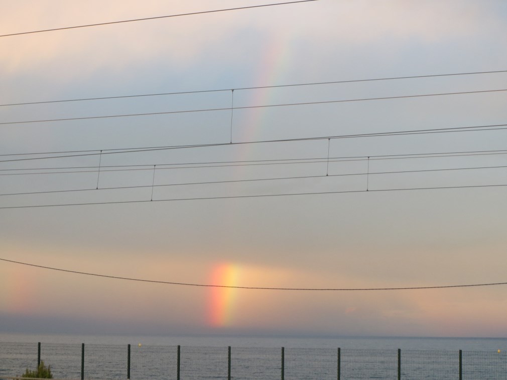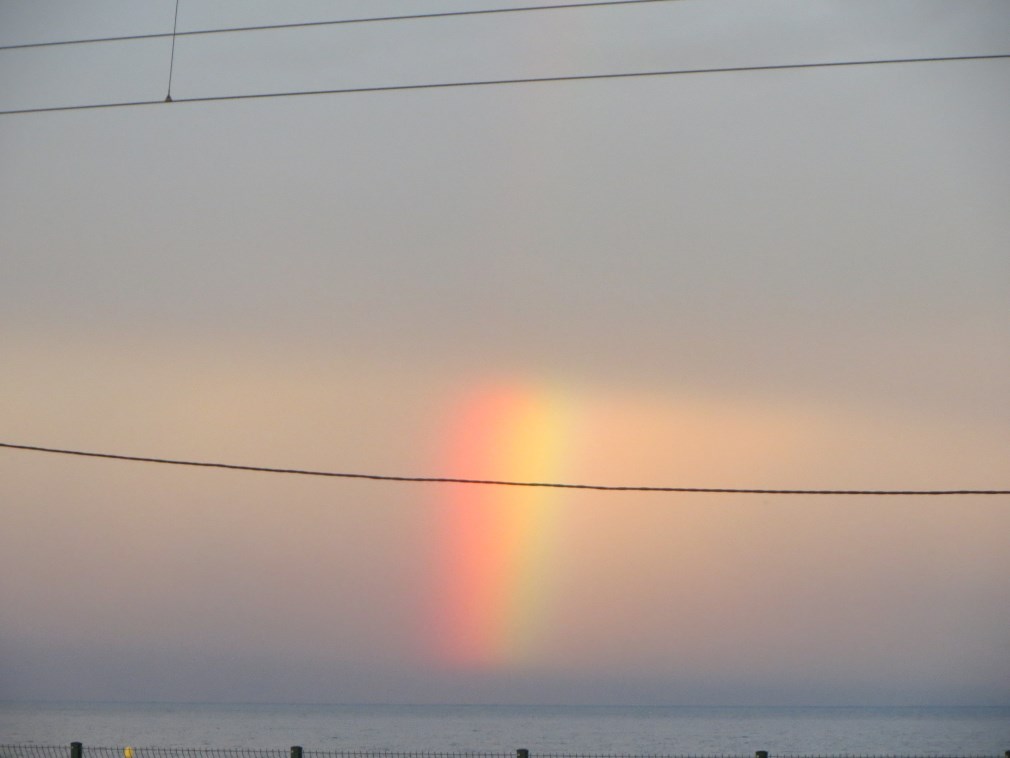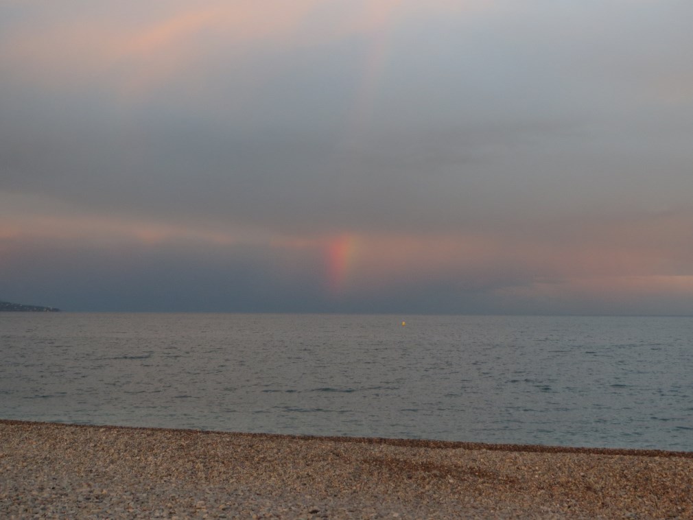Prima di andare a cena andiamo in spiaggia per fotografare un tramonto bellissimo, con arcobaleno e nuvole illuminato di rosso dal sole al tramonto, sembra settembre.
