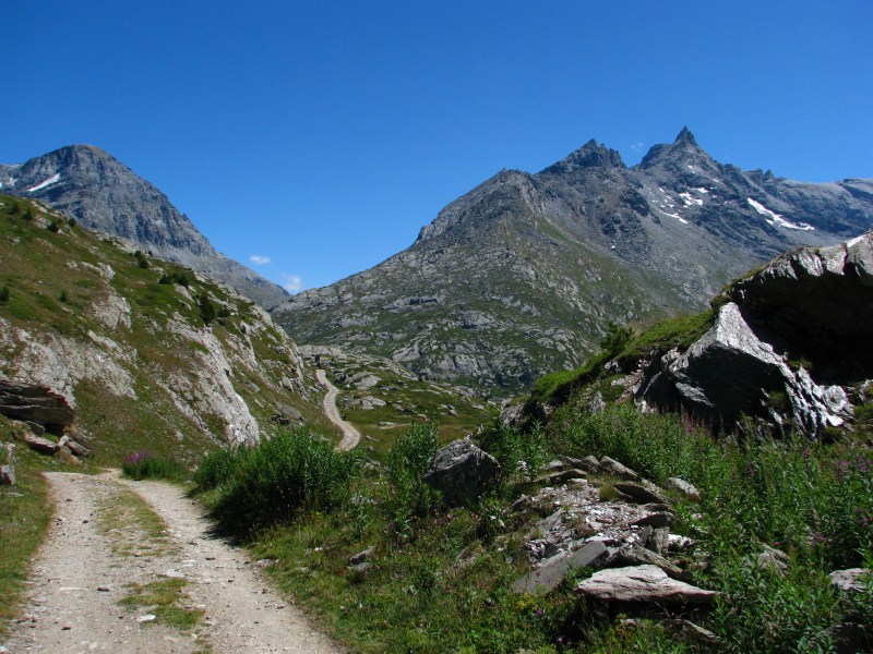 Tornando al diario di oggi, arrivati in fondo alla Diga (si tratta di una diga non in cemento ma in materiale naturale, scarti di cava – barrage a poids viene definito in francese) decidiamo di percorrere una strada che porta in una valle a sud del lago, proseguiamo per oltre 8 km su strada asfaltata e poi sterrata, che proseguirebbe ancora a dire il vero e raggiungiamo i 2183 metri del Colle del Piccolo Moncenisio. Da notare che qui molti contadini tagliano il fieno fino a quota 2100 metri (mai visto da noi).