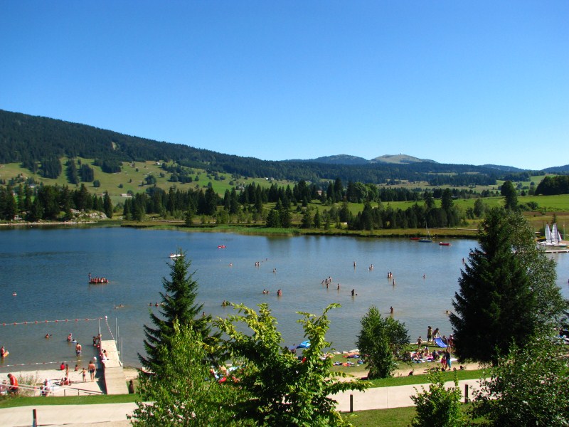 Scendiamo in paese con la cabinovia alle ore 14.30, salutiamo l’albergatrice dell’Hotel du Centre e partiamo alla volta della Svizzera, tutti i 155 km che percorreremo saranno ad una quota compresa tra i 900 ed i 1200 metri, altipiani bellissimi e disabitati. A metà strada circa mi fermerò a fare il bagno nel lago di Rousses (lac des Rousses) posto a quota 1050 metri circa, l’acqua vicino alla riva ha una temperatura di 23°C ma entrando di un centinaio di metri (la profondità è davvero esigua) la temperatura è molto più bassa (sui 21°C).