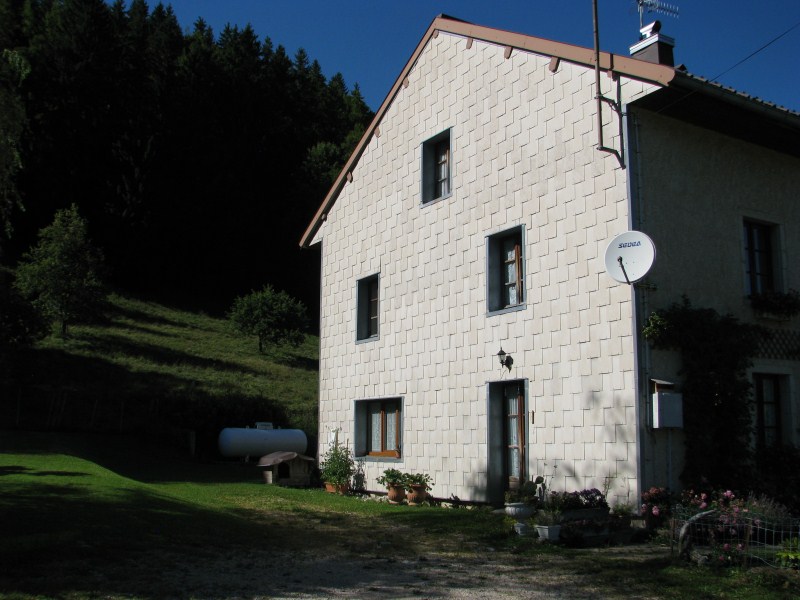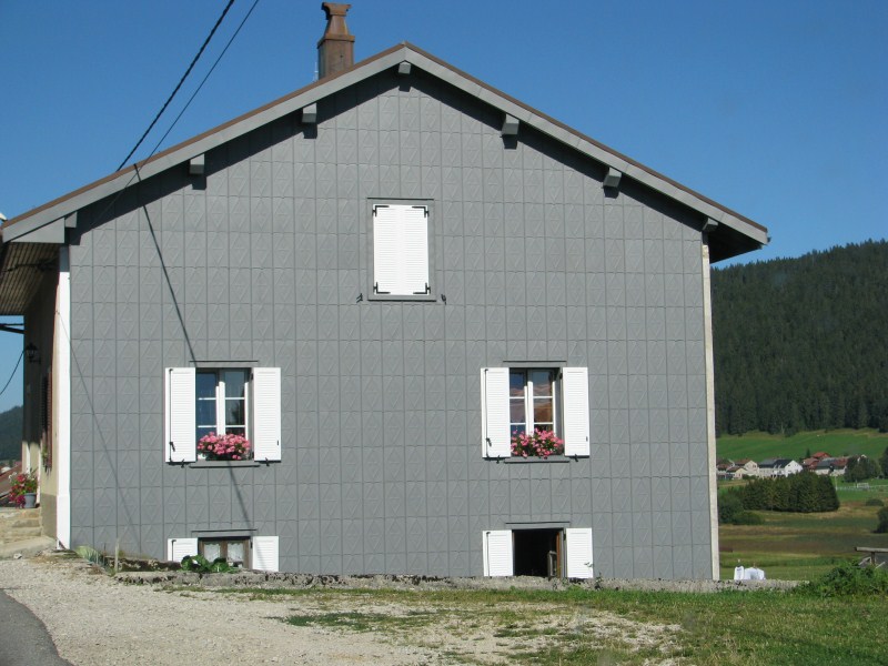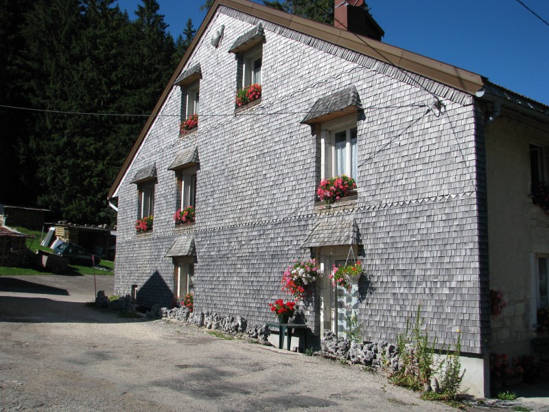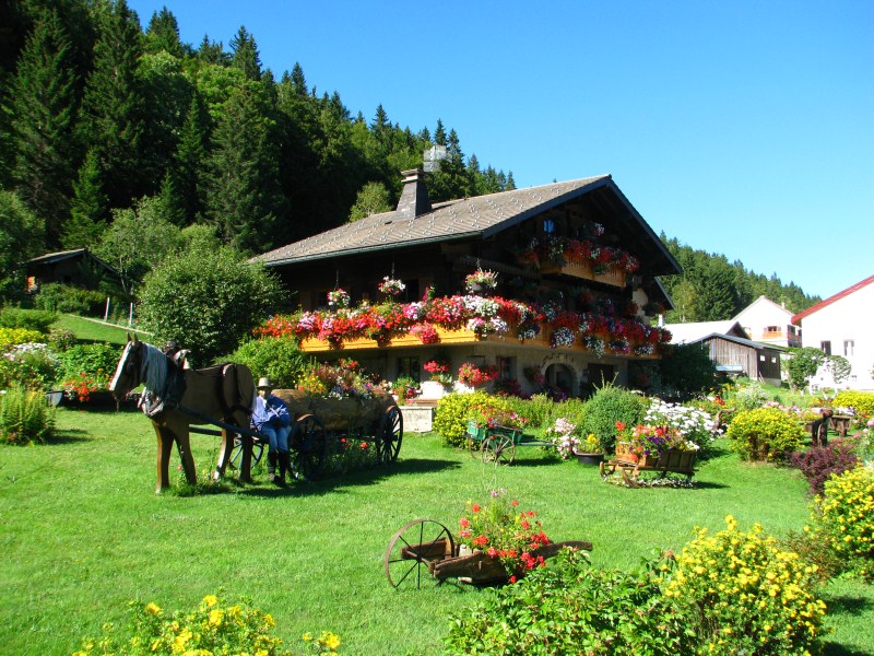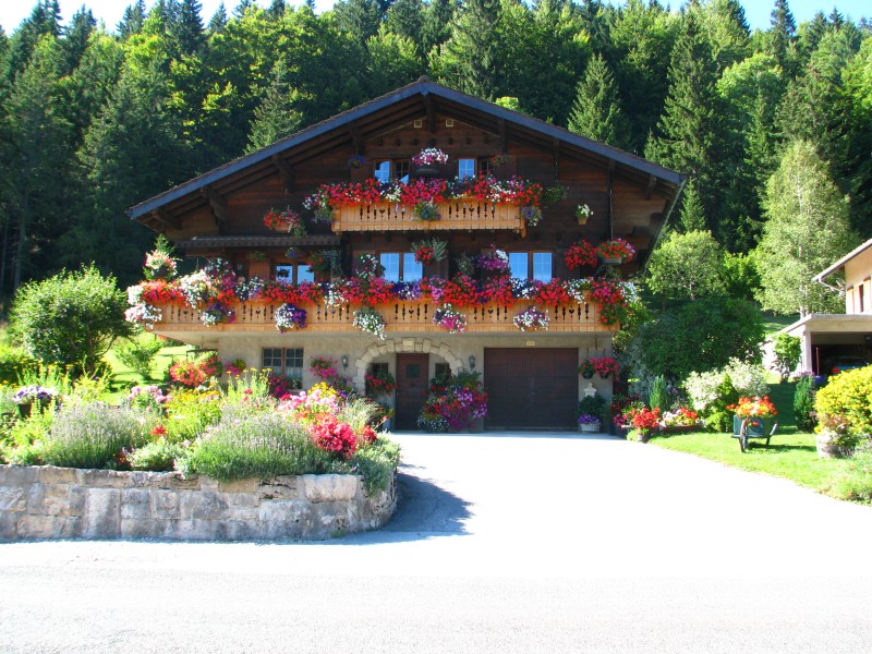 Terminato il bagno partiamo alla volta della frontiera Svizzera, ma pochi km prima di passarla ci fermiamo a fotografare una casa/chalet passesca con tanti fiori come non ne abbiamo mai visti, nel frattempo arriva il proprietario col quale scambiamo 4 chiacchiere, è  molto orgoglioso della sua casa e dei fiori curati dalla moglie. A lui chiedo come mai tutte le case della zona hanno la parete esterna che guarda verso su rivestita di scandole di legno o di lamiera o di materiali plastici, mi spiega che è dovuto alla pioggia che cade trasversalmente e bagna quindi i muri delle case, mi dirà anche che Les Rousses è una zona fredda (-25°C -30°C) e nevosa e che il lago d’inverno è ghiacciato con spessori che arrivano ai 50 cm.