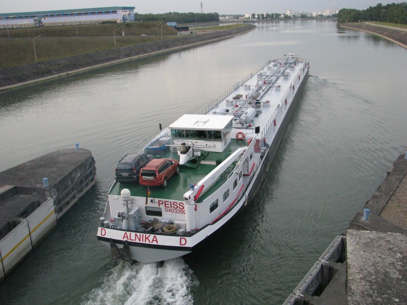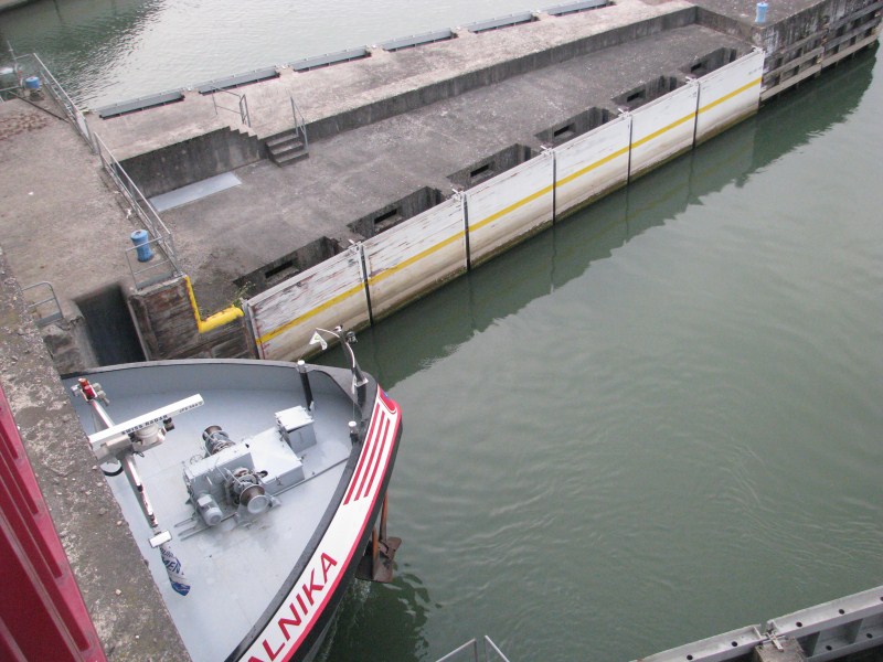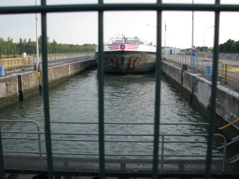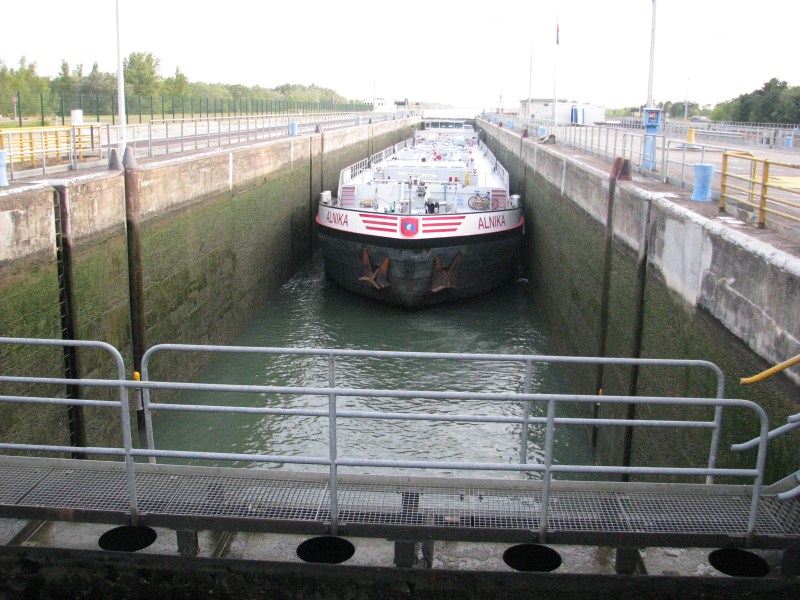 Sul confine Francia Germania ci fermiamo a guardare la spettacolare diga EDF costruita sul Reno e soprattutto le complesse chiuse che regolano la navigazione sul Reno. Resto più di 20 minuti a guardare un’enorme chiatta che entra nel Reno dove è più alto di livello (a sud , a valle) vengono chiuse le paratie, e svuotata la chiusa, la chiatta scende così di circa 15 metri di livello (vedi foto), poi viene aperta la paratia a nord e la chiatta può proseguire la navigazione verso nord.