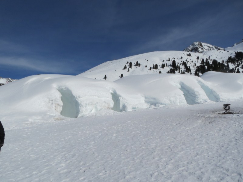 Dopo il pranzo scendiamo ad Innsbruck, il cielo in Austria è sereno (perturbazione da sud…) ed il foehn scalda l’aria in fondovalle, in città il termometro dell’auto raggiunge i 18°C. Prendiamo poi la statale verso Zirl e lì prendiamo la strada che sale a Sellrain, e dopo una breve sosta per acquistare cioccolata, birra e calzini in un MPreis,  alle 14.00 circa arriviamo a Kuehtai. L’igloo village è davvero singolare, sono due complessi con 12 stanze igloo complessive più un super igloo nel quale c’è il bar ed il ristorante, gli igloo fatti a stanza sono alti 5 metri mentre quello del bar è alto 8 metri, viene costruito agli inizi di dicembre ricoprendo un pallone con un metro di neve sopra e tre metri di neve ai lati, poi il pallone viene sgonfiato. Lì incontriamo il biondissimo Philippe nostra guida che ci dice di ritornare alle ore 17.00.