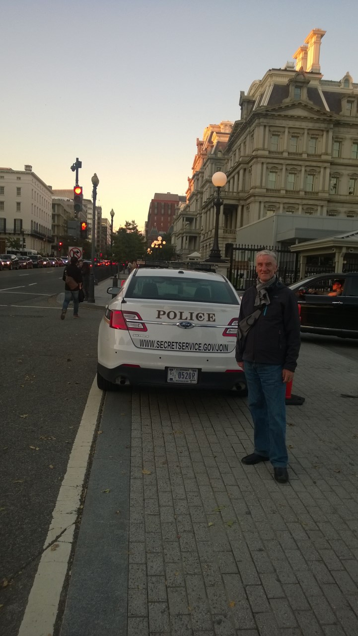 Dopo la National Gallery scendiamo a piedi lungo il Mall fino al Washington Monument, e da lì raggiungiamo in breve tempo la White House, la Casa Bianca, dove scattiamo alcune foto, alle spalle dell'albero di Natale Nazionale. Con il binocolo osservo il tetto della Casa Bianca, dove ci sono diversi cecchini con carabine con binocolo.