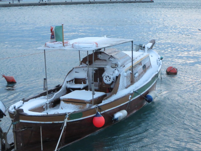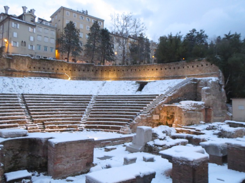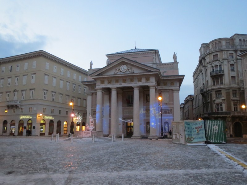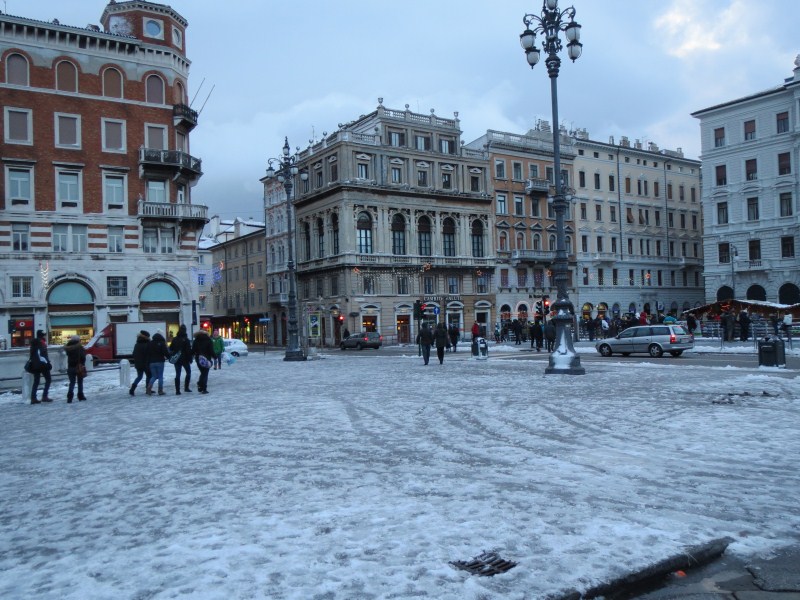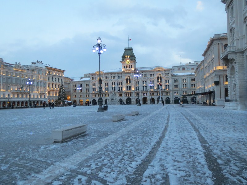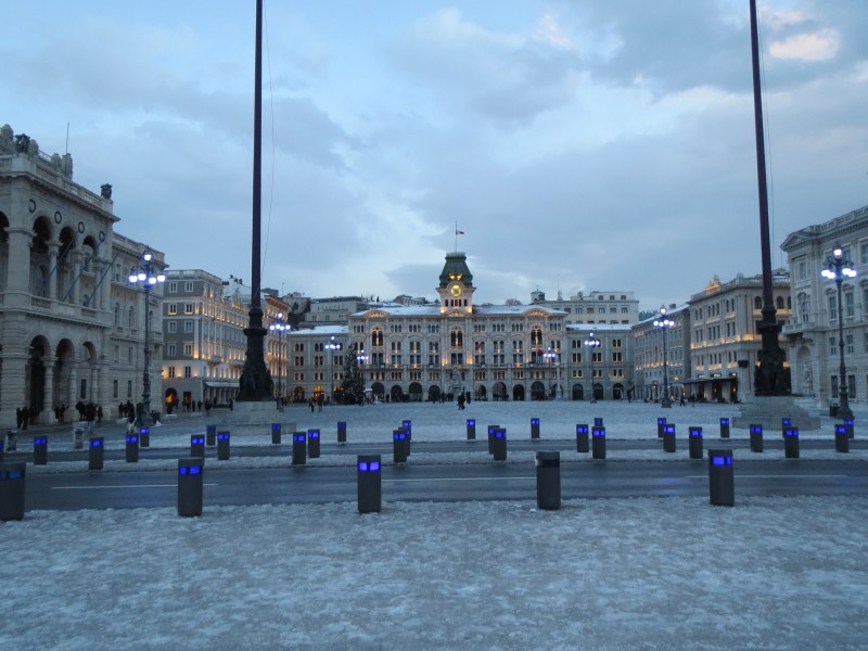 Le strade sono tuttavia pulite fin tanto che si arriva a Trieste, dove invece le strade laterali sono delle piste da pattinaggio. Prendamo stanza al Residence Bonomo, dopodiché scendiamo in centro città, c'è un vento fortissimo, ghiaccio sui marciapiedi e molta neve, la città è bella, certo è che il freddo e le raffiche non aiutano a visitarla, almeno oggi, certo è che il paesaggio è fantastico e l'occasione dal punto di vista meteo è eccezionale, bisogna tornare indietro al 2003 per ritrovare una condizione simile.