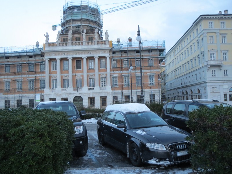 Recuperata l'auto alle 08.00 al parcheggio alla Malpensa (dove c'è un po' di neve e la mattina ha fatto -6°C), partiamo alla volta di Trieste, dove arriviamo dopo 5 ore di viaggio e 470 km. Il paesaggio è innevato dalla Malpensa a Trieste, ma è al Trieste dove è caduta più neve, tant'è che l'autostrada a Re di Puglia è chiusa e ci sono 9 km di coda anche perché in Slovenia la situazione delle strade è ancora peggiore e sono chiusi anche i due valichi di frontiera, allora usciamo a Villesse e facciamo la strada statale costiera. Molta la neve caduta in zona che varia dai 5 ai 25 cm.