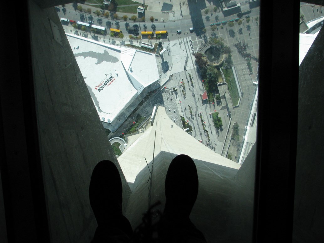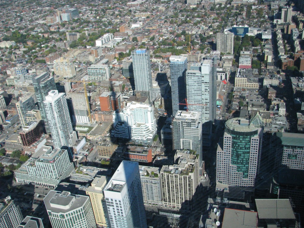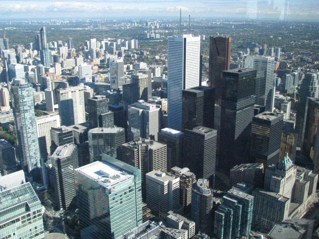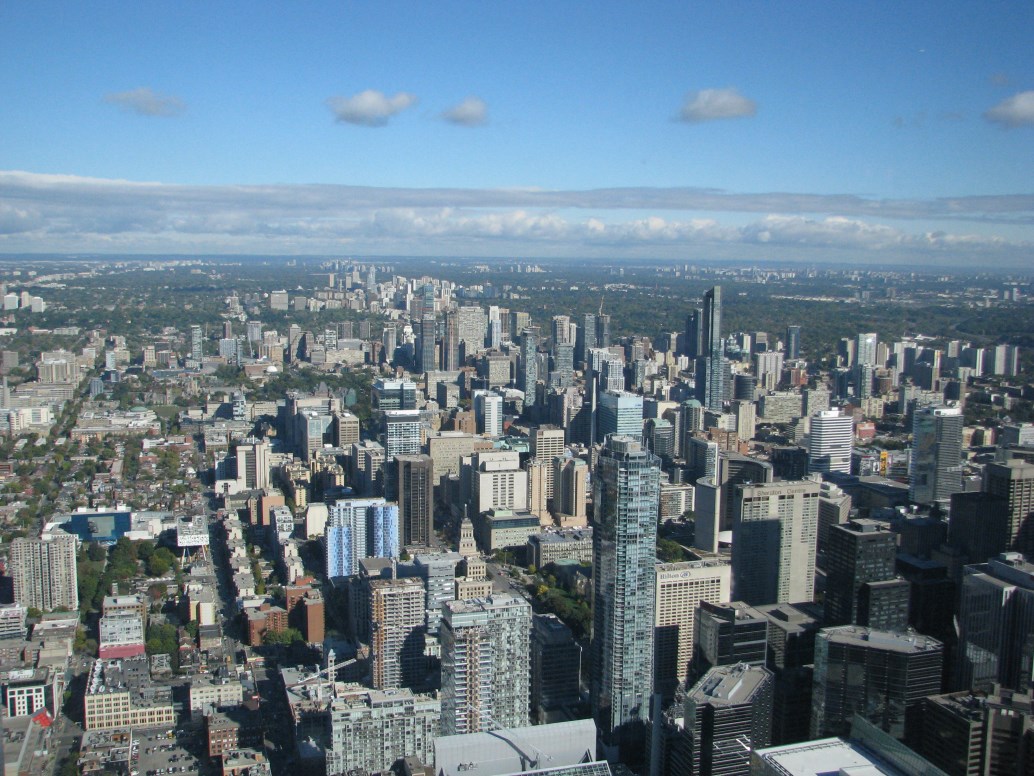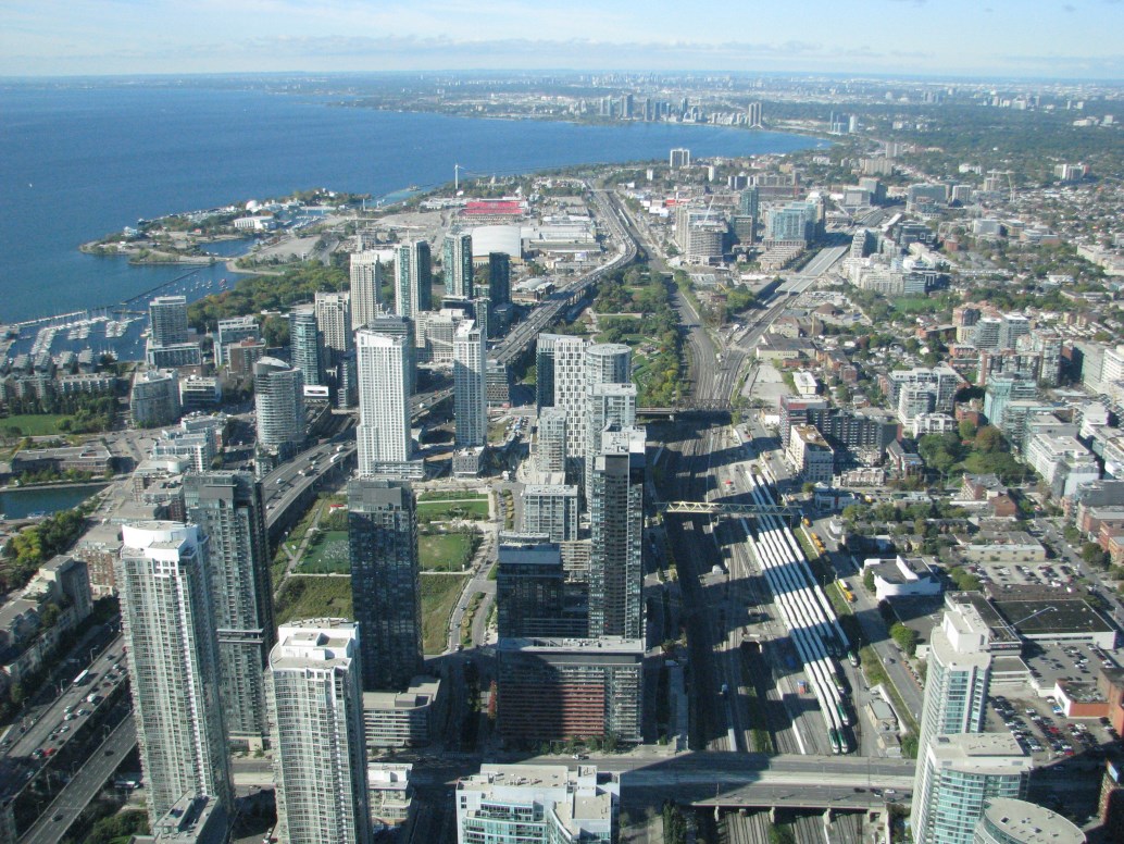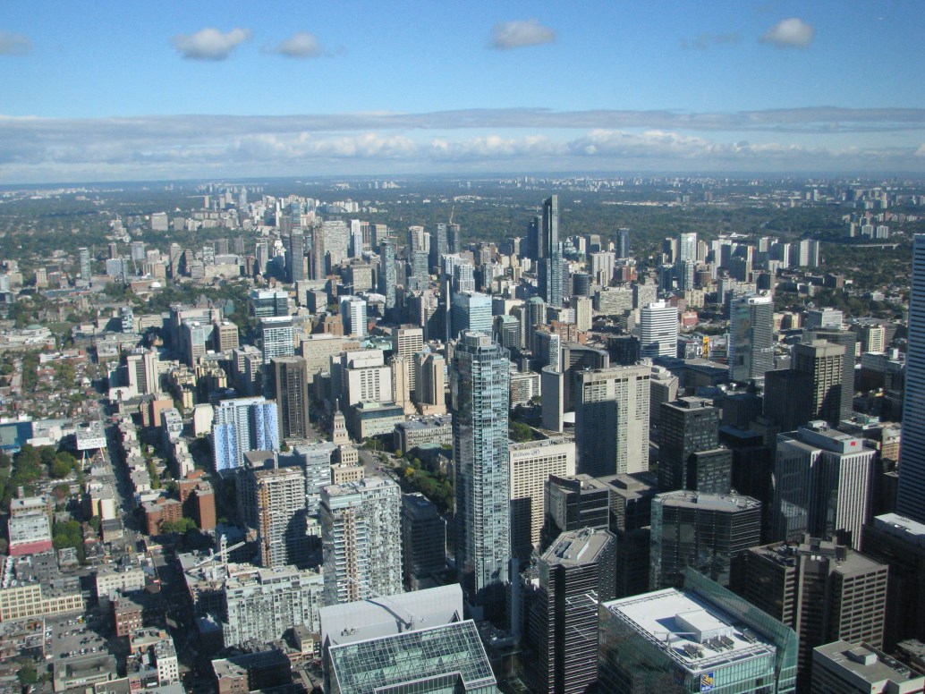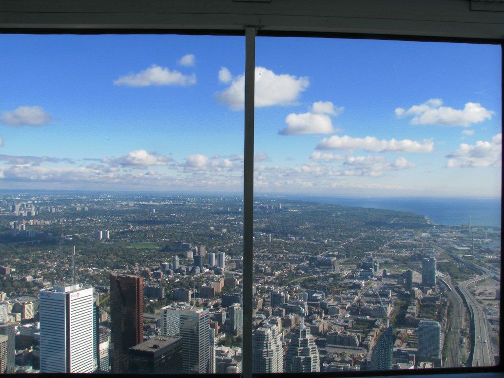 Dopo la sveglia e la colazione al Comfort Inn di Toronto, scendiamo a Downtown, dove arriviamo dopo circa mezz'ora, appena arrivati la prima cosa che ti colpisce sono i grattacieli e soprattutto la CN Tower, una delle torri più alte al mondo con i suoi 553 metri ed i canadesi ne vanno fieri, è l'orgoglio nazionale. Parcheggiamo sotto la torre (solito parcheggio economico da 17 $) e saliamo sulla torre fino ai 443 metri del secondo ascensore (costo dei biglietti 50 "sacchi" a testa, uno sproposito), la vista comunque è fantastica, oltre che sulla città di Toronto, sul lago Ontario, è talmente terso oggi il cielo che riusciamo a vedere perfino le cascate del Niagara ad occhio nudo (sono 130 km in auto...e 70 km in linea d'aria) ed i grattacieli e le torri poste proprie alle cascate del Niagara. Nella CN Tower c'è anche un pavimento di vetro nel quale si può provare il brivido di camminare quasi nel vuoto ad oltre 300 metri di altezza.