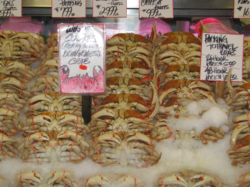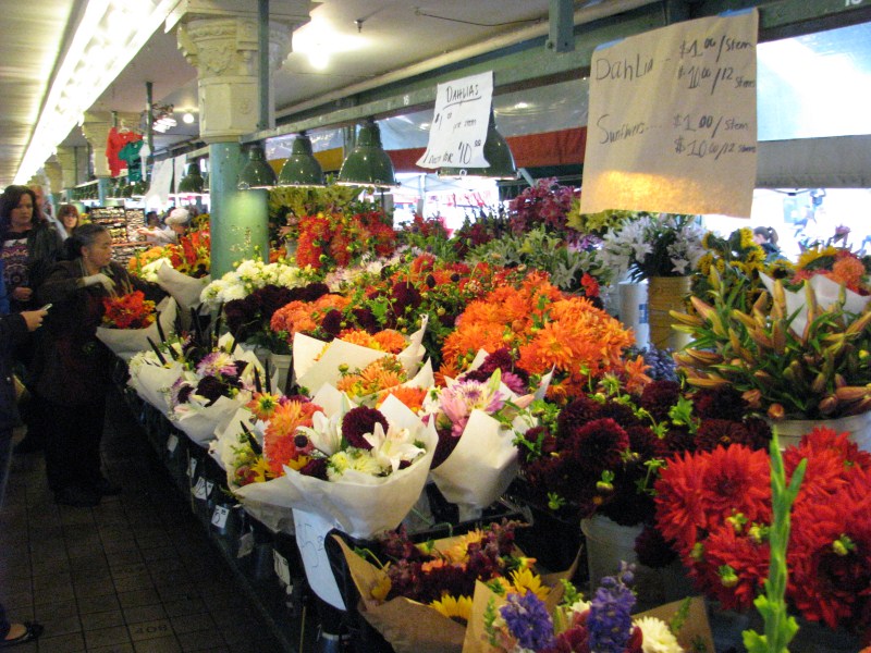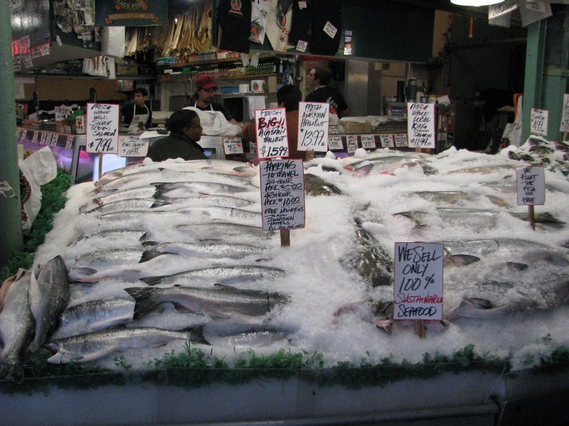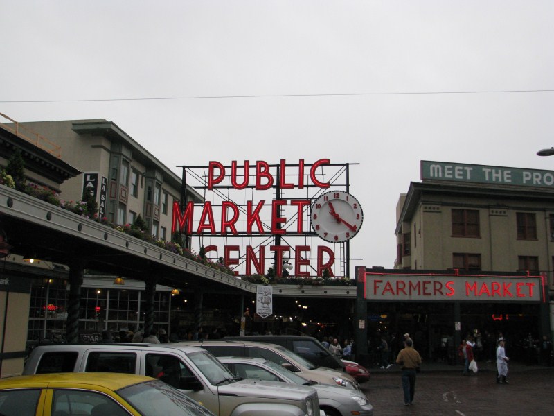 Prima cosa che andiamo a vedere è il Park Pie Market, uno storico mercato situato nella downtown di Seattle, dove ci sono degli enormi banchi di pesce (la caratteristica è il lancio del salmone acquistato, che un commesso lancia all’altro in stile lancio palla da football) dove si trovano enormi salmoni, granchi ed ogni altro pesce o crostaceo del Pacifico. Nel mercato si vende di tutto ma il bello è guardare i pesci ed i fiori. All’interno dell’edificio che ospita il mercato ci sono moltissimi negozietti, si va dal negozio specifico in gadget relativi a cani e gatti, al negozio che vende riviste vintage compresi vecchi numeri di Life e Playboy, negozi che vendono spezie, statue, sculture, riproduzioni in cartone di attori ed Obama ecc… una babele di negozi.