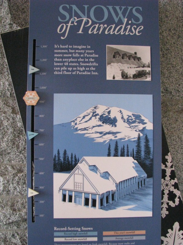 dopo la sveglia lasciamo il Motel Motor Inn nel quale non ho potuto fare a meno di fotografare il decoder della TV via cavo blindato come una cassaforte, facciamo colazione a Puyallup in un Donut gestito da asiatici, molto gentili e ci chiedono se siamo francesi, la gente quando ci vede in questi posti dispersi si chiede sempre cosa diavolo facciamo lì. Partiamo alla volta del Mount Rainier National Park, sulla cartina sembrano pochi km ma ce ne vorranno 120 per raggiungere il visitor center. Man mano che saliamo nel parco la temperatura cala, da 10°C arriviamo a 0°C, all’entrata del parco posso utilizzare il mio pass annuale acquistato un anno fa, c’è una Ranger bionda sui 30 anni, niente male all’entrata che ci informa che alcune strade sono chiuse (io avevo già verificato via internet la mattina). Raggiungiamo Paradise che è il posto più nevoso degli USA ed uno dei più nevosi al mondo, si trova a quota 1647 metri ed ha una nevosità media di 17,17 metri l’anno, il record è di 28 metri di neve in un anno, lo scorso inverno sono caduti 23,6 metri di neve.