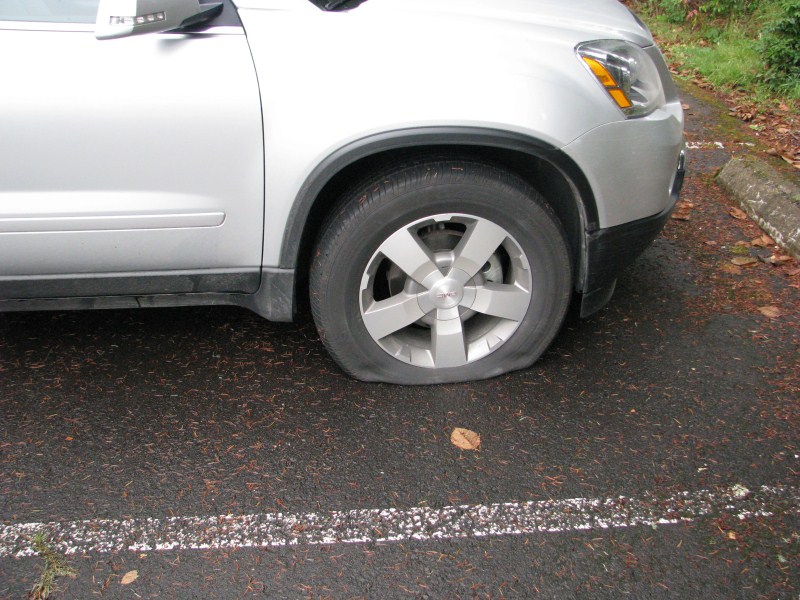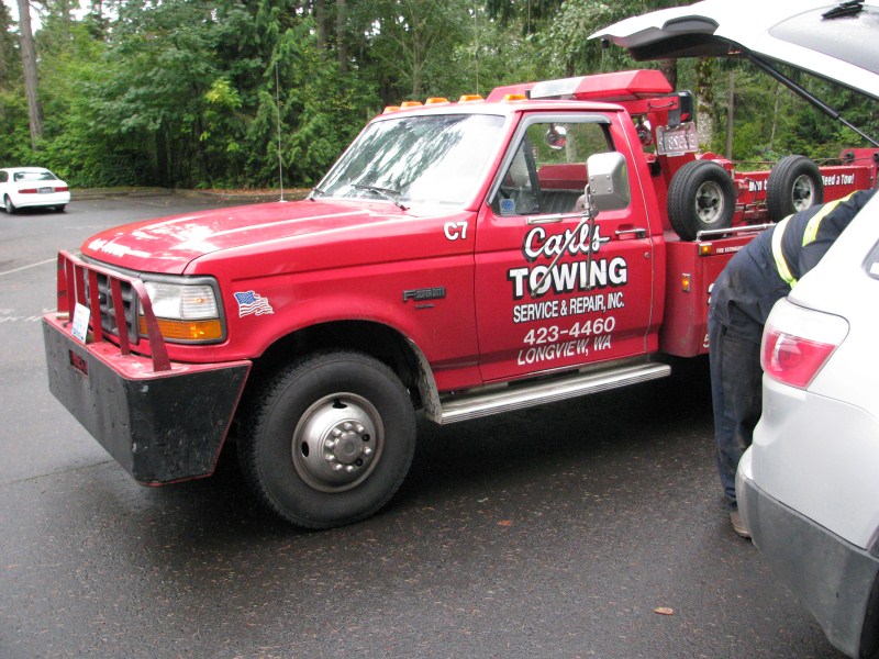 Terminata la visita partiamo alla volta del monte St Helens, il punto di osservazione si trova a ben 76 km dal visitor center, man mano che saliamo piove fortissimo e la nebbia diventa un muro, percorriamo circa 40 km e decidiamo di tornare indietro, non si vede niente e sulla strada cadono alcuni sassi, appena mi giro e riparto con la gomma passo sopra dei sassi, evitando i più grossi, non succede nulla subito, ma dopo pochi chilometri il computer di bordo mi segnala che sta calando la pressione del pneumatico anteriore destro, guardo la pressione e man mano che scendo verso valle scende anche la pressione, da 225 pressione del pneumatico di sinistra sono già a 140, tengo duro per raggiungere il visitor center e non fermarmi sotto la pioggia in mezzo al nulla, dopo oltre 30 km arriviamo al visitor center, pressione a 76 e pneumatico quasi a terra, c’è un taglio di circa 3 cm nella gomma. Entriamo nel visitor center e chiediamo ad una delle impiegate di aiutarci e chiamare il numero verde della hertz, in quanto spiegarsi al telefono sarebbe un problema (già lo è a volte vis a vis), e soprattutto dobbiamo spiegare dove ci troviamo (3029 di Spirit Lake  - Castle Rock WA 98611), quelli della Hertz super efficienti mi mettono a disposizione un interprete francese al quale spiego tutto quello che è successo, alternando qualche comunicazione in inglese con l’operatrice della Hertz, mi dicono che dopo la sostituzione della gomma dovrò ripararla e che il costo mi verrà rimborsato. In 45 minuti arriva il carro attrezzi, guidato da un ragazzone biondo, un metro e novanta per 140 kg buoni, ci cambia la gomma e scopriamo di avere un ruotino, chiediamo al lui se può ripararci la gomma ma ci indica dove andare ovvero a Longview, a voce sembra che dobbiamo fare due curve, poi gli chiedo di inserire l’indirizzo nel navigatore, il posto si troverà infatti a 36 km da lì, impossibile arrivarci con due spiegazioni a voce.