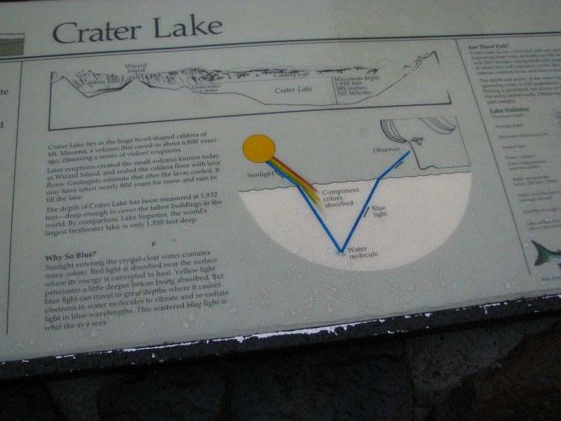 Risveglio nel Best Western di Grants Pass sotto una pioggia battente, facciamo colazione, passiamo un attimo da Wal Mart ad acquistare degli antidolorofici per la mia anca e partiamo alla volta del Crater Lake (150 km), raggiungiamo i 2165 metri della caldera del Crater Lake, al suolo c’è ancora qualche cm di neve della recente nevicata e la nebbia è talmente fitta che riesco a malapena a vedere l’acqua del lago, che si trova a 1882 metri, quindi ben 283 metri più in basso. Il cratere si è formato da una mega eruzione vulcanica di una montagna il Mount Mazuma avvenuta circa 7700 anni fa, il lago è profondo fino a 594 metri è le dimensioni sono 9 km per 8 km, la profondità media è di 350 metri.
