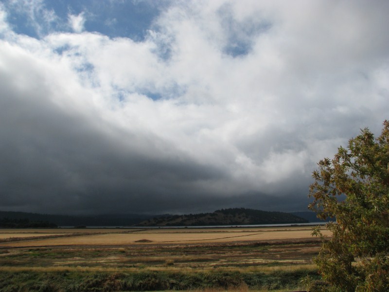 La perturbazione ci concede un break, il cielo si apre e possiamo ammirare un cielo azzurro solcato da nuvole basse e soprattutto da una lenticolare sopra un cono vulcanico, tipo quelle che si formano sul Monte Rainier o sullo Shasta (quest’ultimo un vulcano vicino alle Lava Beds che si eleva fino a quota 4317 metri. Restiamo stupiti dal tramonto, cielo azzurro, nuvole scure, arcobaleno, sole che illumina un vulcano, alberi che assumono colorazioni intense, solo questo tramonto valeva la vacanza, ho scattato foto tra le più belle che abbia mai fatto.