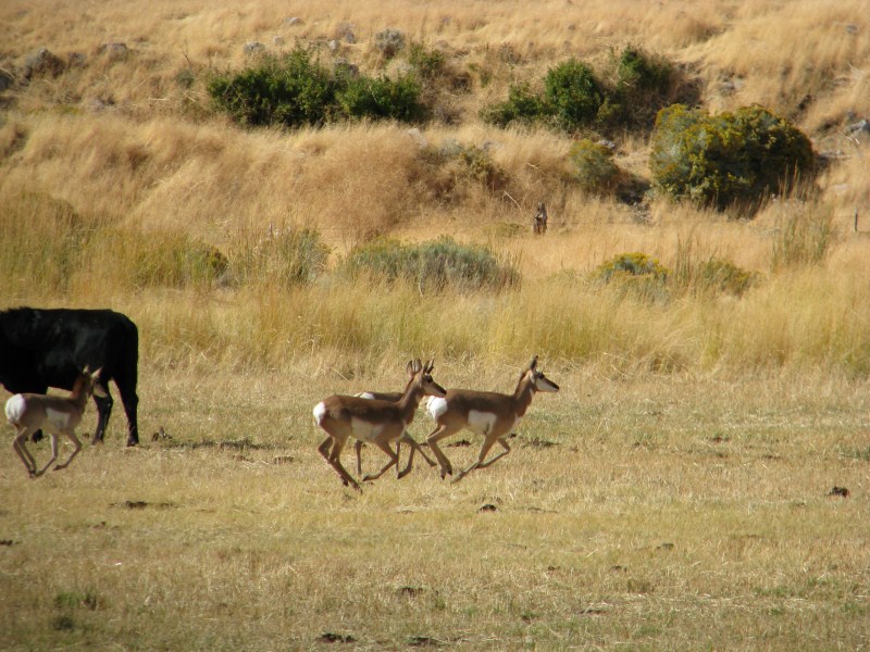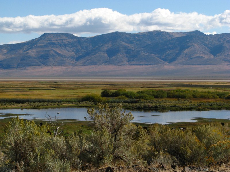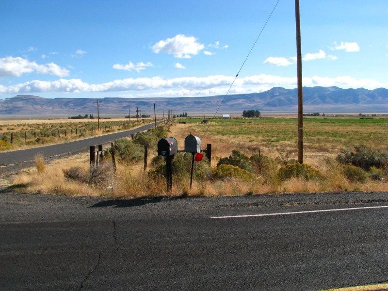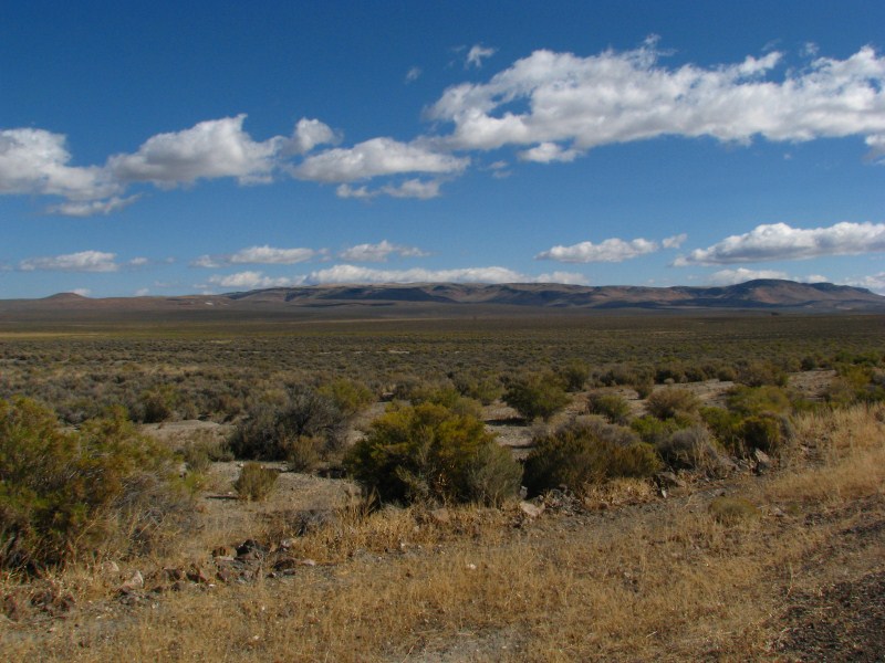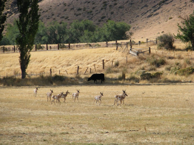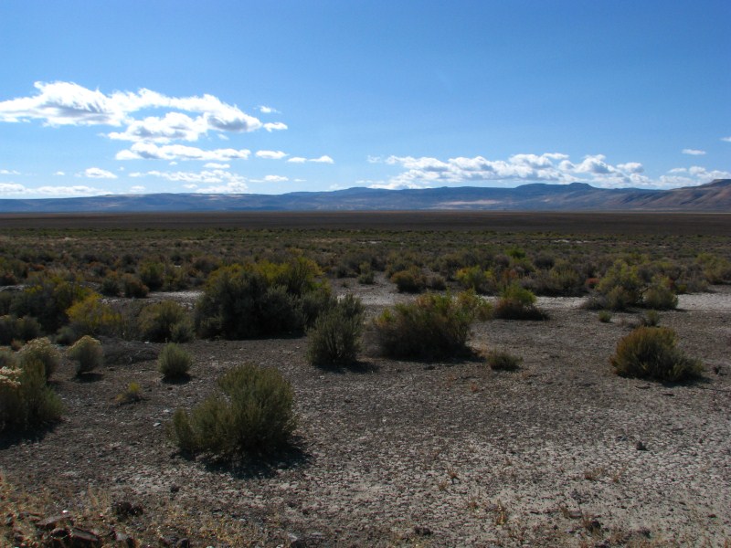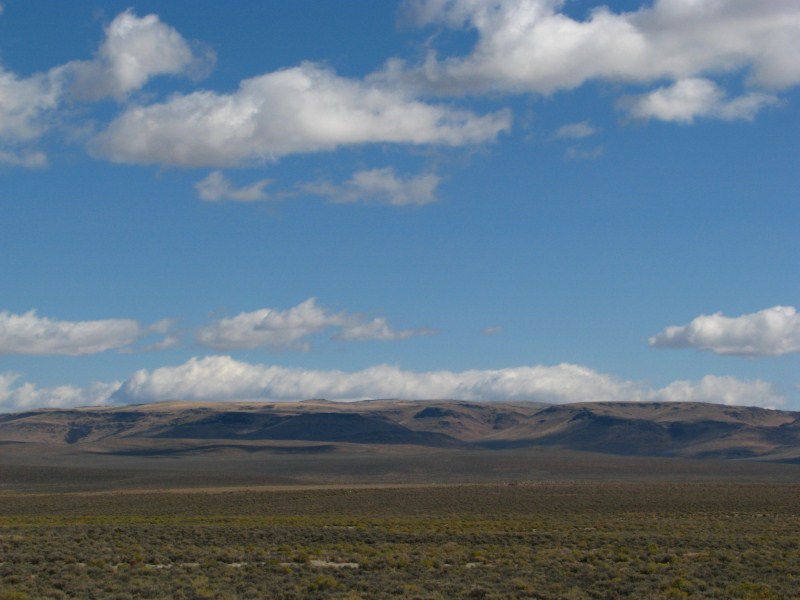 Giornata davvero emozionante quella di oggi ed alquanto inattesa in quanto non programmata, appena alzati facciamo colazione nella minuscola sala colazioni del Best Western (solo 2 tavoli ma eravamo soli), dopo aver guardato un po’ di webcam, satellite e weather channel (cosa fatta peraltro tutti gli altri giorni) decidiamo di rinunciare al Monte Shasta ed al Lassen Volcanic NP per andare verso il Nevada, zona notoriamente poco piovosa e soprattutto perché stufi di rischiare di prendere nebbia, in fin dei conti viviamo in montagna e vedere il deserto ci entusiasma molto di più. Mai scelta fu più azzeccata, lasciata Alturas (quota 1300 metri) iniziamo a salire e raggiungiamo un passo a circa 1900 metri che ci porta in una vallata enorme sempre in California dove c’è il lago Middle Alkali Lake, raggiunto il minuscolo paese di Eagleville entriamo in Nevada e difficile da credere percorriamo ben 112 km prima di arrivare ad un altro paese, in mezzo dapprima un po’ di pascoli, in mezzo alle mucche vediamo anche delle antilocapre bellissime, poi solo deserto, un paesaggio fantastico, il panorama permette di vedere fino ad oltre 100 km di distanza, il primo paese che incontriamo è Gerlach, prima di entrare in paese troviamo un serpente morto sulla strada, mi fermo, mi sembra proprio un serpente a sonagli, forse giovane perché non vedo il sonaglio (si forma con la pelle morta). Dopo Gerlach è la volta di Empire, il cartello di entrata nel paese recita popolazione 350 abitanti altitudine 4000 piedi (1200 metri), ma qualcuno con lo spray ha cancellato i 350 e scritto 5, in effetti le case sono davvero 4 in croce, posto davvero fuori dal Mondo.