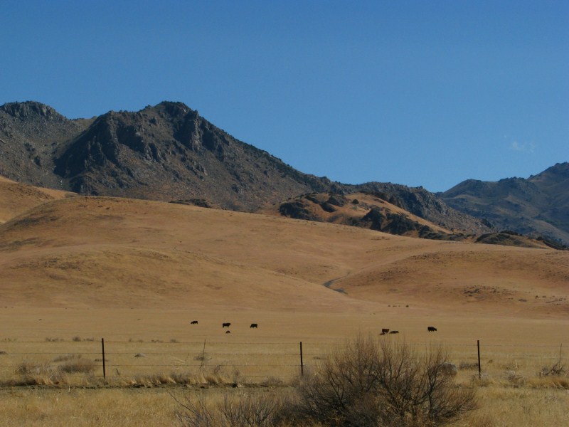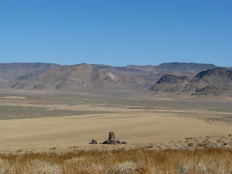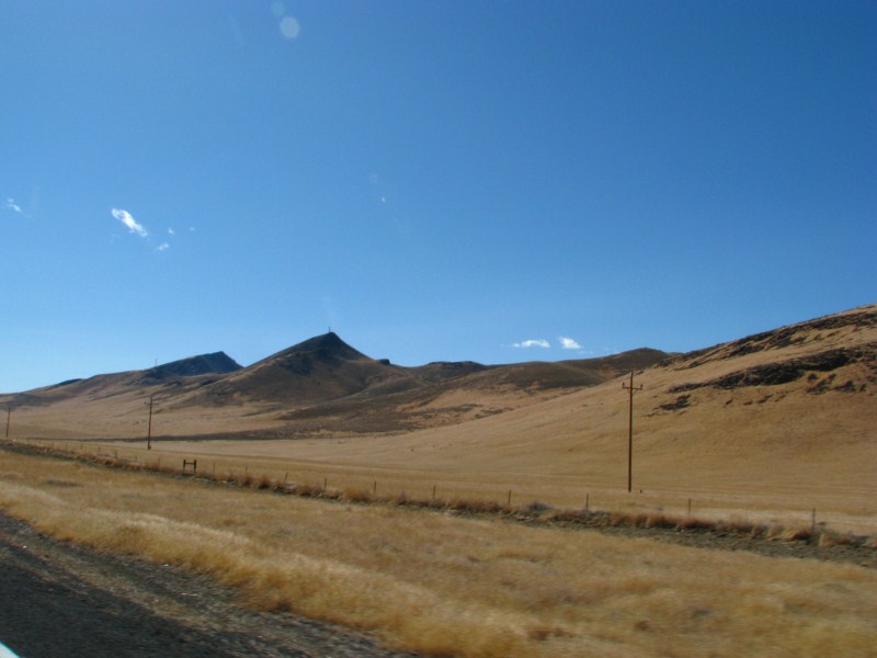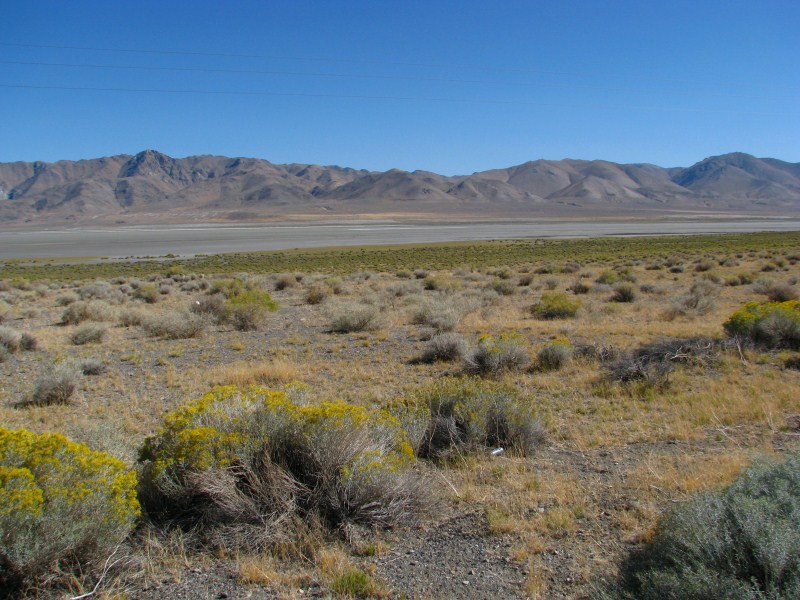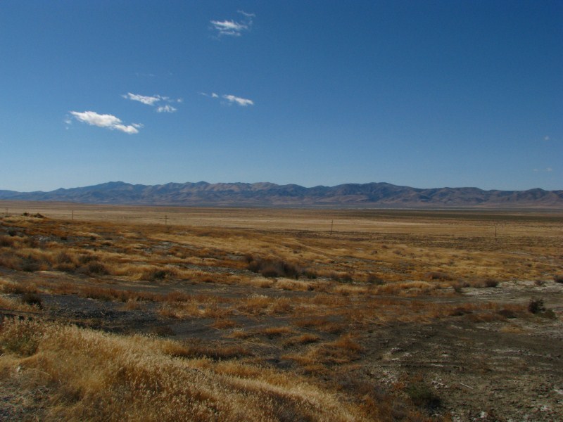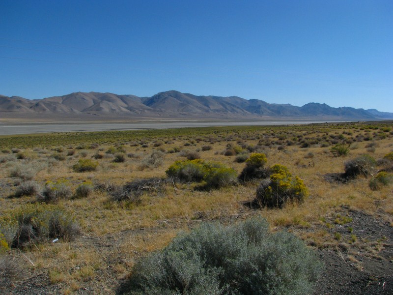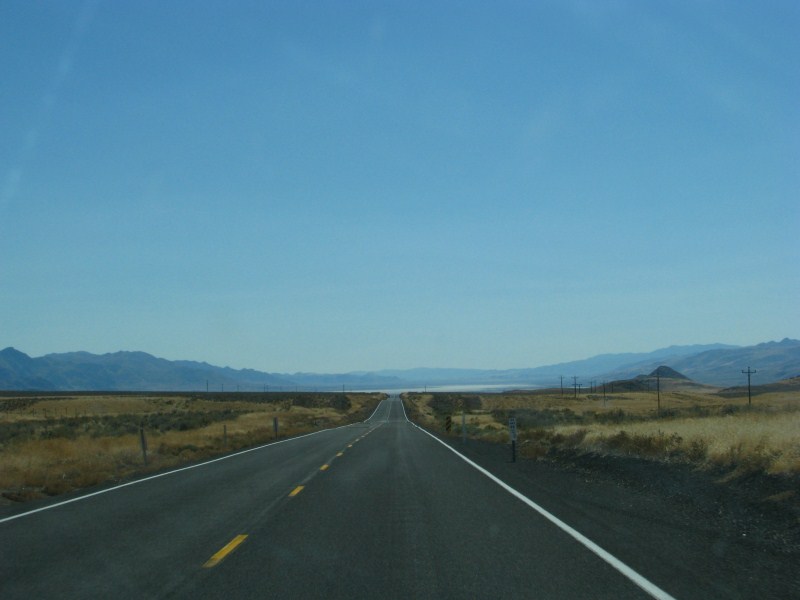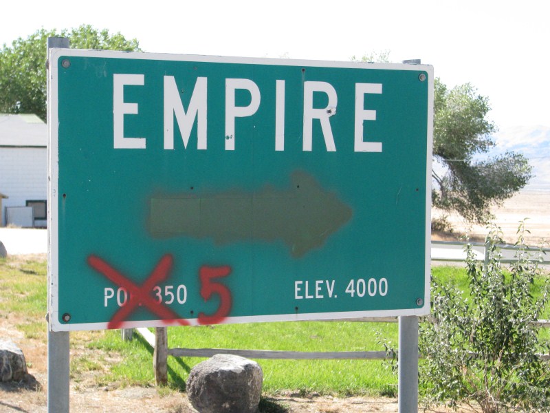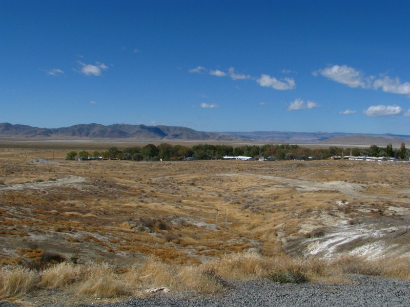 Giornata davvero emozionante quella di oggi ed alquanto inattesa in quanto non programmata, appena alzati facciamo colazione nella minuscola sala colazioni del Best Western (solo 2 tavoli ma eravamo soli), dopo aver guardato un po’ di webcam, satellite e weather channel (cosa fatta peraltro tutti gli altri giorni) decidiamo di rinunciare al Monte Shasta ed al Lassen Volcanic NP per andare verso il Nevada, zona notoriamente poco piovosa e soprattutto perché stufi di rischiare di prendere nebbia, in fin dei conti viviamo in montagna e vedere il deserto ci entusiasma molto di più. Mai scelta fu più azzeccata, lasciata Alturas (quota 1300 metri) iniziamo a salire e raggiungiamo un passo a circa 1900 metri che ci porta in una vallata enorme sempre in California dove c’è il lago Middle Alkali Lake, raggiunto il minuscolo paese di Eagleville entriamo in Nevada e difficile da credere percorriamo ben 112 km prima di arrivare ad un altro paese, in mezzo dapprima un po’ di pascoli, in mezzo alle mucche vediamo anche delle antilocapre bellissime, poi solo deserto, un paesaggio fantastico, il panorama permette di vedere fino ad oltre 100 km di distanza, il primo paese che incontriamo è Gerlach, prima di entrare in paese troviamo un serpente morto sulla strada, mi fermo, mi sembra proprio un serpente a sonagli, forse giovane perché non vedo il sonaglio (si forma con la pelle morta). Dopo Gerlach è la volta di Empire, il cartello di entrata nel paese recita popolazione 350 abitanti altitudine 4000 piedi (1200 metri), ma qualcuno con lo spray ha cancellato i 350 e scritto 5, in effetti le case sono davvero 4 in croce, posto davvero fuori dal Mondo.