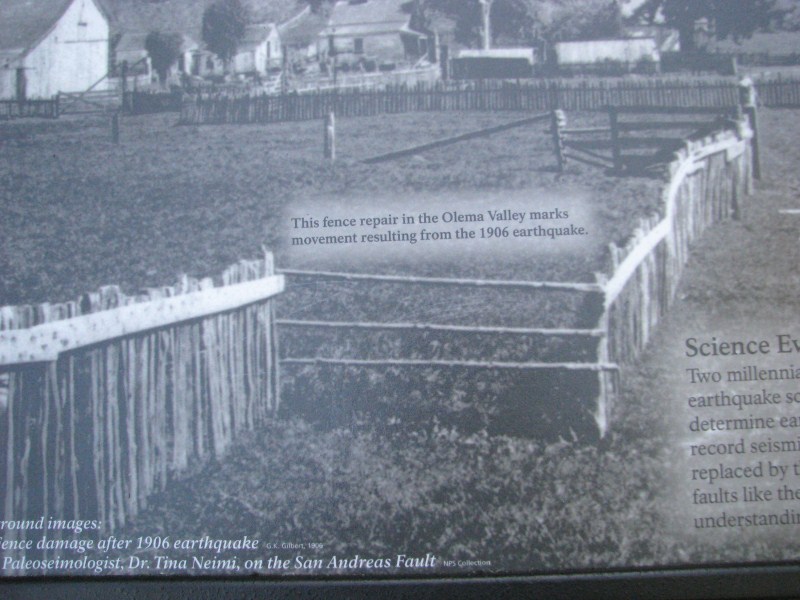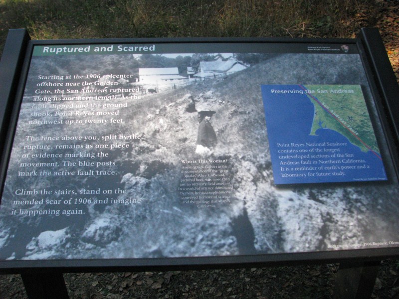 Dopo aver percorso una interminabile strada con mille curve sulla costa, arriviamo a Point Reyes che è un parco nazionale famoso per le proprie coste, ma soprattutto perché di là passa la Faglia di Sant’Andrea, percorriamo il sentiero del “terremoto”, passato alla storia perché nel famoso terremoto di San Francisco del 1906 la terra si “spaccò” di oltre 4 metri. C’è una foto di un recinto che prima del terremoto era perfettamente allineato, in seguito per unire le due sezioni sono stati posizionati dei pali lunghi appunto 4 metri.