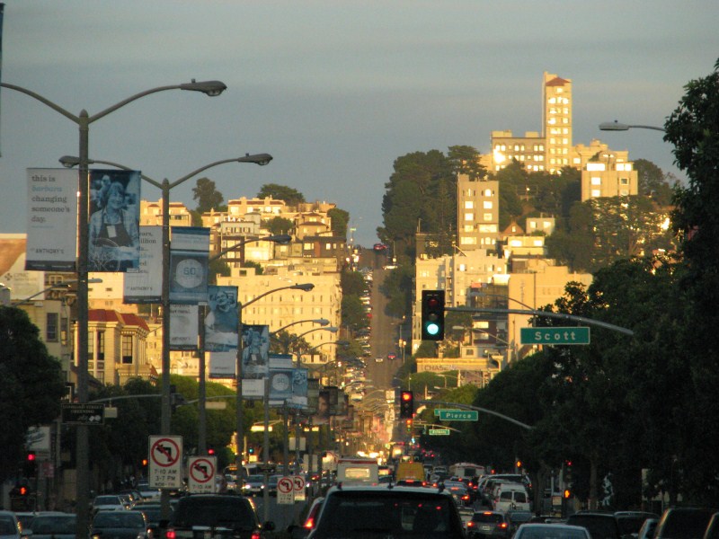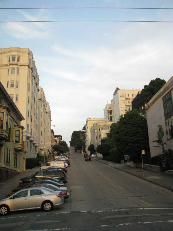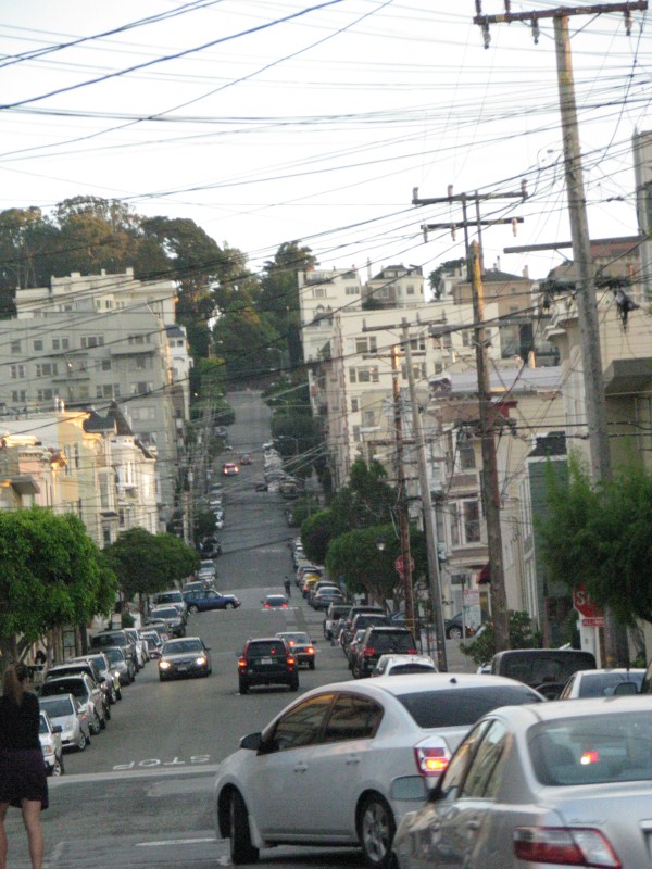 Terminiamo la cena verso le 22.30, ci avviamo verso l’auto dove arriviamo alle 23.00, facciamo un giro di circa un’ora per le strade in salita e discesa da film (in tutti i sensi ) di San Francisco, passiamo anche a vedere la mitica Lombard Street la strada più corta e con più curve al mondo (così dicono se ben ricordo) poi decidiamo di non prendere una camera in hotel, parcheggiamo l’auto davanti al concessionario della Jaguar di San Francisco e facciamo un pisolino da mezzanotte e mezza alle 2, alle due iniziano a lavare le strade e tutti spostano l’auto con una puntualità svizzera. In quell’ora è mezza è incredibile la gente che è passata in auto, autobus, piedi e bici, la città è vivissima, troppo per i miei gusti.  Ci sono numerosi homeless che dormono per strada o chiedono l’elemosina, mi fanno una tristezza tremenda.
