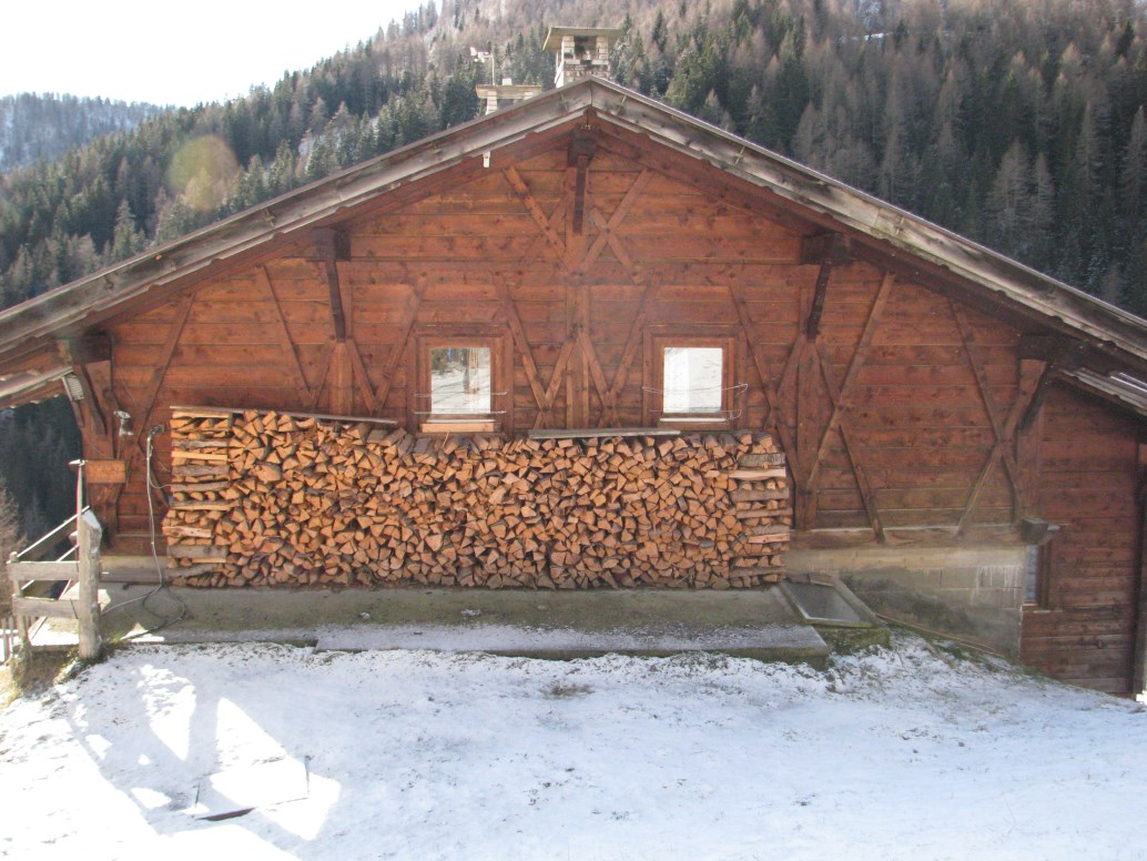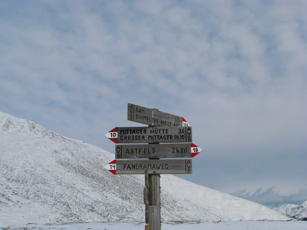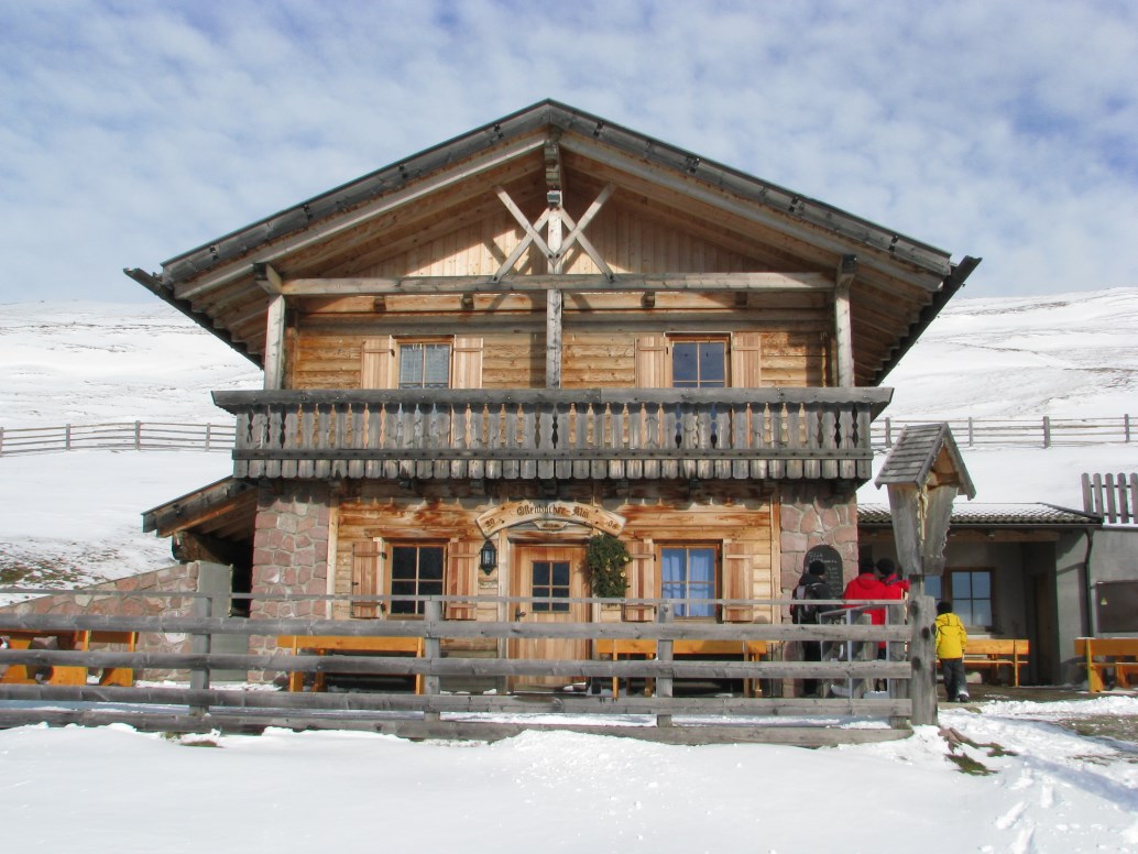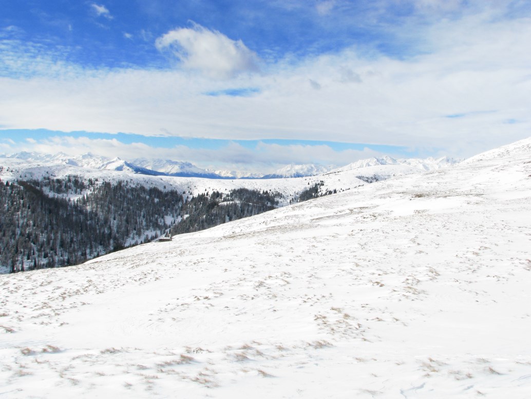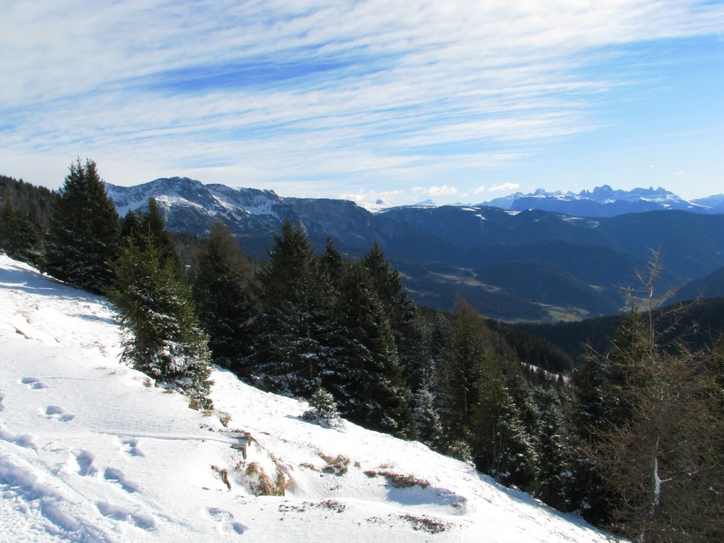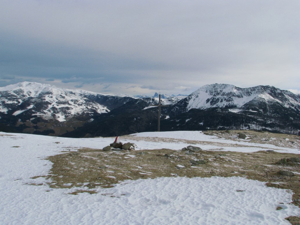 Giornata particolare dal punto di vista meteo, con uno "sfondamento" da nord che nella notte ha portato pioggia in fondovalle e neve sopra i 1600 metri in Alto Adige. Giunti a Sarentino giriamo a sinistra e saliamo in auto fino all'ultimo maso abitato a quota 1638 metri (Obermarchen). La poca neve ed il ghiaccio rendono molto scivolosa la salita. Portiamo le ciaspole ma non le mettiamo. Giunti ai 1942 metri della Ottenbacher Alm prendiamo a destra e raggiungiamo la bellissima Cima Sam o Ottenbacher Berg a quota 2137 metri. Tira un vento con raffiche intorno agli 80 km/h in cima, la vista è particolare, a nord il cielo è nuvoloso mentre a sud è tutto sereno.