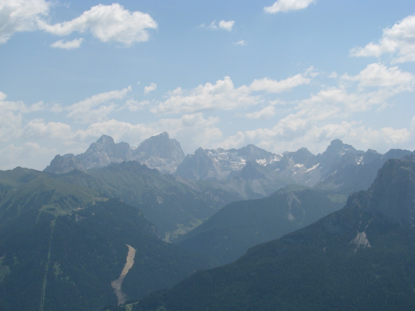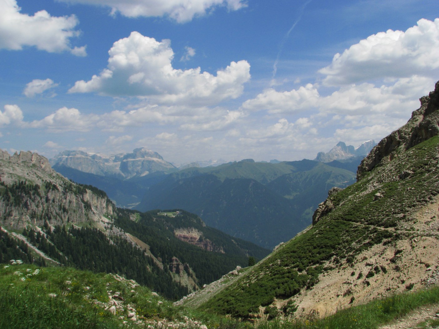 Dopo pranzo saliamo una cinquantina di metri sopra il rifugio per prendere il sole. L’escursione che inizialmente doveva essere di circa 600 metri di dislivello e circolare, si conclude mestamente con 200 metri ed una bella abbuffata. Tuttavia il panorama da lì è fantastico, si vede il Sella, la Marmolada, le Coronelle, il Gruppo di Cima Uomo, il lagorai, il Latemar ecc….