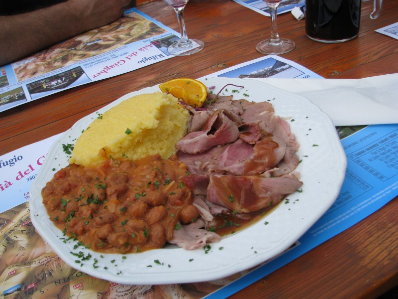 Dopo esserci fermati per una breve sosta sul Sous l’Aut (il vento tira a 45 km/h e la temperatura è di 14°C), scendiamo rapidamente sulle piste da sci nella conca del Ciampac e ci fermiamo a mangiare al Tobià del Giagher, polenta porchetta e fagioli, il vino rosso che ci viene portato non è buono, lo facciamo presente al gestore che si scusa, lo sostituiamo con due birre Weizen, il gestore poi ci offrirà 4 grappe per scusarsi.