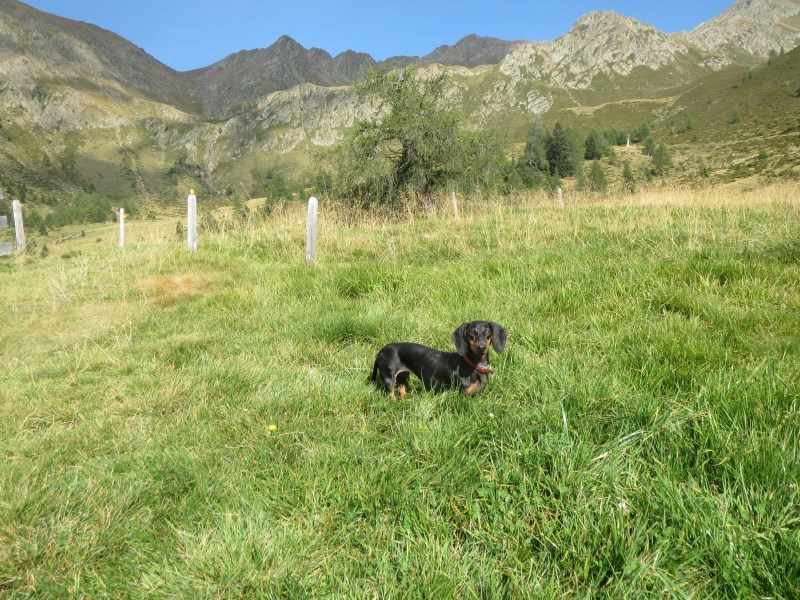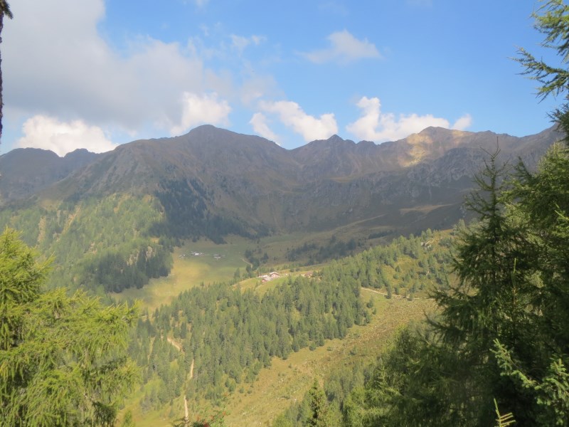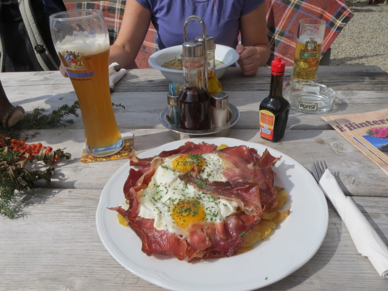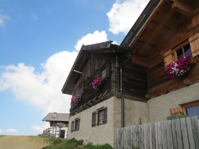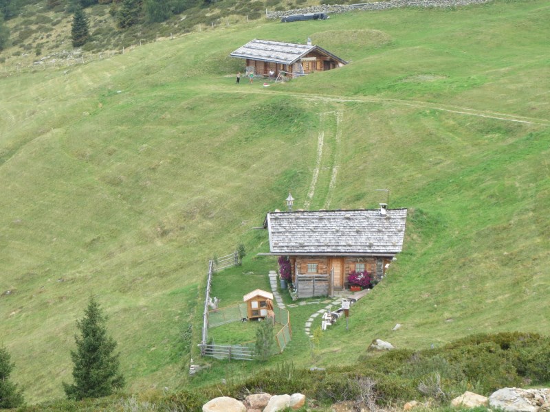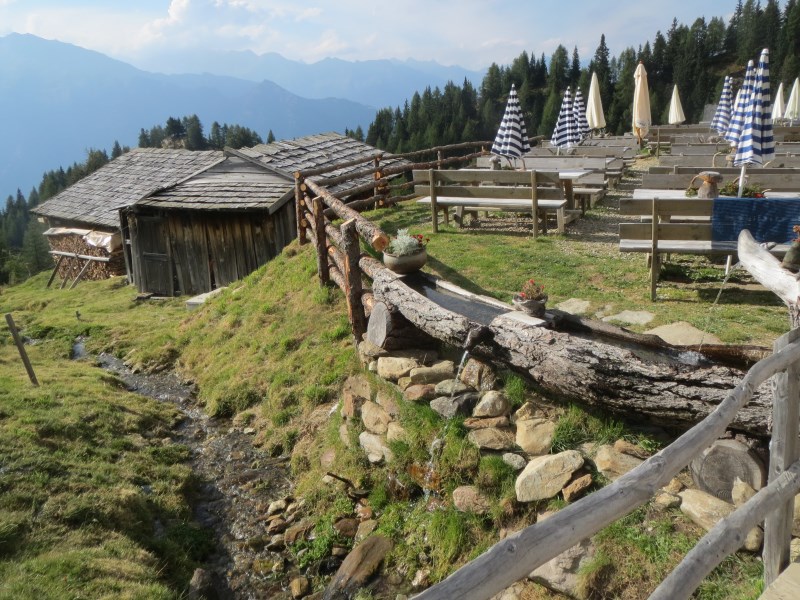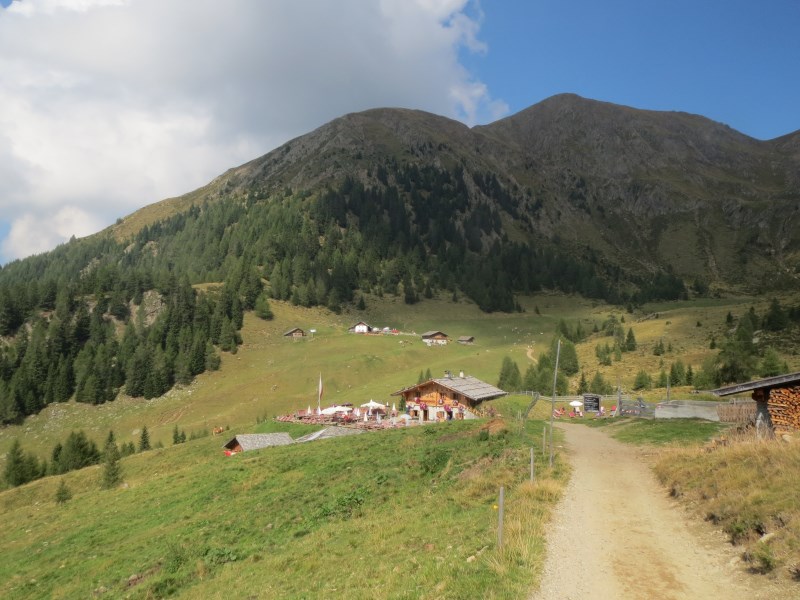 Il dislivello totale è di soli 226 metri, dai 1980 metri della partenza breve discesa e poi salita fino alla Tallneralm per poi risalire ancora fino a quota 2030 metri circa, poi si scende fino ai 1974 metri della Hintereggalm dove mangiamo alle 15.30, molto bella questa malga, dove ogni tavolo ha un corno di cervo e tutte le panche sono munite di coperta a quadrettoni, ottimo il cibo e cordiali i gestori.